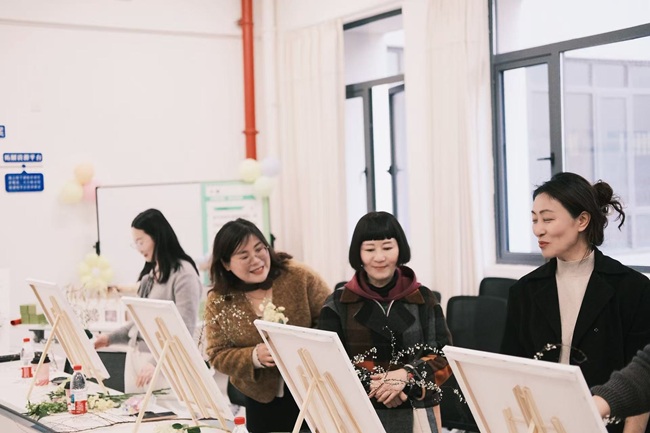 油画插花环节将活动氛围推向高潮。专业指导老师现场细致讲解花材养护技巧、花艺构图设计与搭配方法,老师们手持花材、精心甄选,在修剪、搭配、造型的过程中沉浸创作。创作之余,老师们相互交流心得、切磋技艺,在动手实践中舒缓了日常工作的压力,陶冶了情操,更在温馨的互动中增进了彼此情谊。