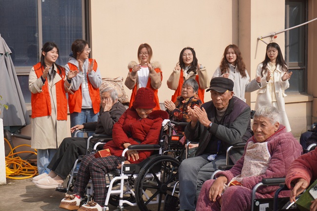 3月25日下午,国际经贸学院爱心社46名志愿者在社团指导老师李国玮的带领下,走进高淳湖滨第一养老院,开展“情暖桑榆 爱心助老”志愿服务行动。活动前,爱心社组织志愿者精心筹备文艺节目、暖心礼品与急救科普素材,并提前与养老院工作人员沟通,确保活动贴心暖心。抵达后,志愿者搀扶老人、递茶唠家常,倾听过往、细问起居,让养老院充满欢声笑语。志愿者们带来了《最炫民族风》《奢香夫人》等文艺表演,赢得老人阵阵欢笑;趣味推瓶游戏中,为获胜老人送上檀木梳、艾草枕头等实用礼品。同时,志愿者面向护工开展急救科普,讲解心肺复苏与日常应急知识,助力提升护工急救能力,守护老人安全。此次活动既温暖了老人心灵,也让志愿者在实践中践行责任、感悟敬老意义。