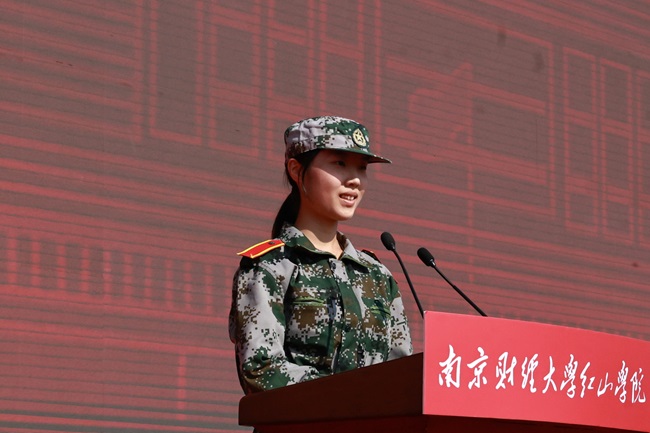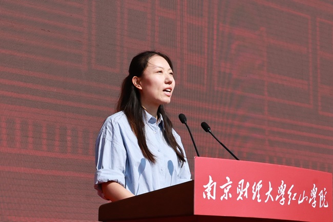 新生代表税收2554班曹家汇同学发言。她代表全体新生表示,大学是梦想的全新起点,大学四年将认真学好专业,锻炼真本事,严格要求自己,不断坚持梦想,始终心怀家国,把个人成长融入民族复兴伟业之中。
