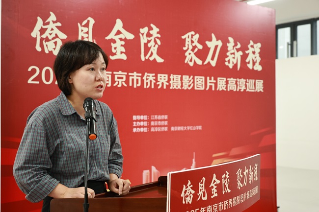 淳溪街道河滨社区党总支书记、居委会主任吕碧璇结合日常工作,期望通过展览,让更多人能够感受到侨界力量,让邻里情、家国情更浓。红山学院副院长程宏云作为曾访美高校教师,深感每幅作品背后的难忘岁月与家国情怀,它们跨越山海,记录侨界投身建设、新侨创业、老侨恋乡及中外交流瞬间,是侨界共同记忆与奋斗精神缩影。南京高淳区茗鑫经济林果种植家庭农场负责人、高淳区欧美同学会名誉副会长殷娟作为一名海外归来的“新农人”,期望能将对家乡的热爱转化为实干的力量,让更多“侨”的故事在高淳这片土地上续写精彩。