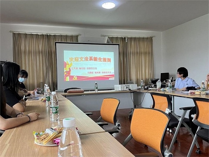 为迎接新生,文法系准备了一些特色活动,二年级辅导员李子钰在教务楼四楼悬挂了书法作品《劝学》喜迎新生入学。此外,文法系老师精心布置会议室,新生们完成报到手续后来到会议室,迎面看到投影上“立大志,展宏图,圆理想之梦;求真知,惜光阴,铸崭新未来”的寄语,老师们贴心地为大一新生准备了小零食,“吃的是零食,回忆的是美好”。一张张热情的笑脸,一句句亲切的问候,一项项贴心的服务,让他们在入学第一天就感受到了来自大学和文法系的温暖。
