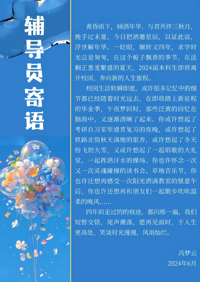 辅导员冯梦云老师为即将踏上旅程的毕业生们送上了最殷切的叮咛与最诚挚的祝福。她从学习、生活、工作等多个角度向即将踏入社会的同学们提出期许,为同学们做出人生指引。她强调,希望大家珍惜在学校的最后一段时光,以文明、有序、和谐的方式告别母校。