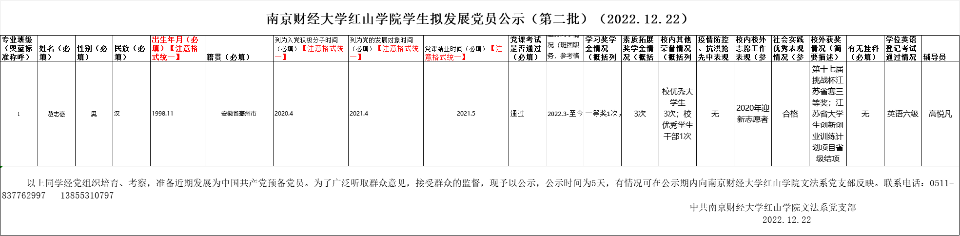 南京财经大学红山学院文法系党支部学生拟发展党员公示(2022.12)(第二批)