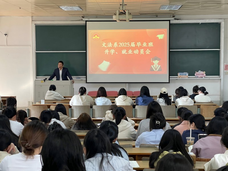 为切实做好毕业生就业升学指导工作,引导学生做好毕业准备和去向选择,助力学生提高就业择业的积极性和主动性,文法系近期在福建路校区召开了2025届毕业班升学、就业动员会。会议由毕业班辅导员赵佳奇主持,文法系主任李磊、党总支副书记陈萱、团总支书记兼学工秘书赵悌芳及2021级全体毕业班学生参加了此次会议。