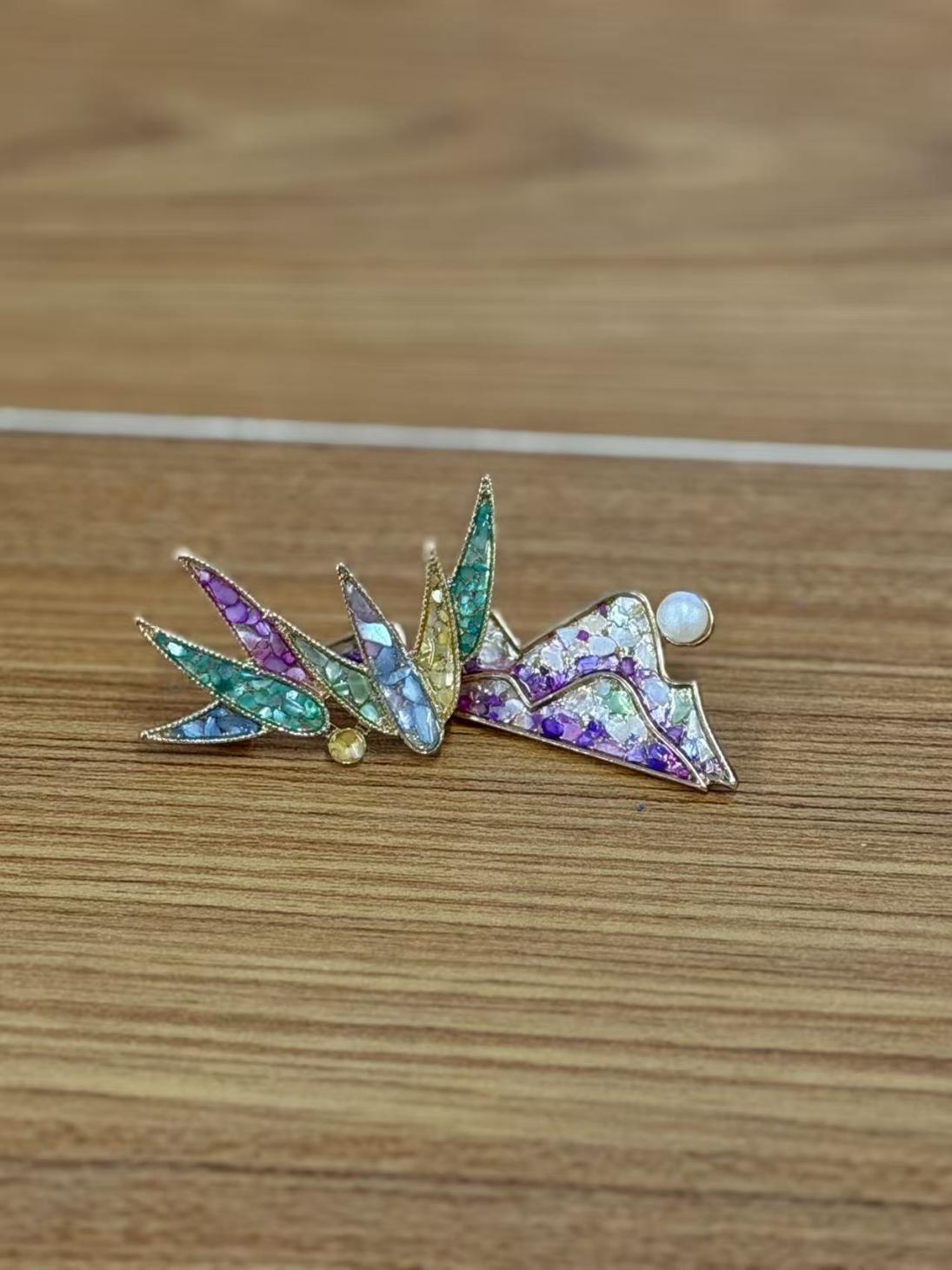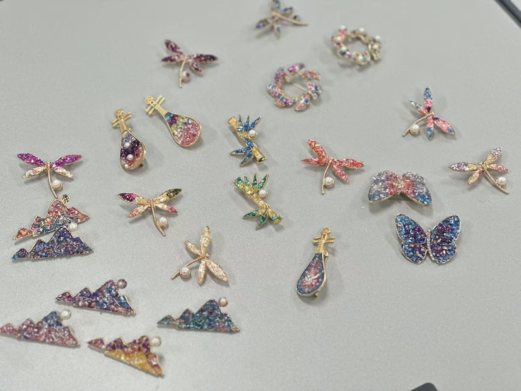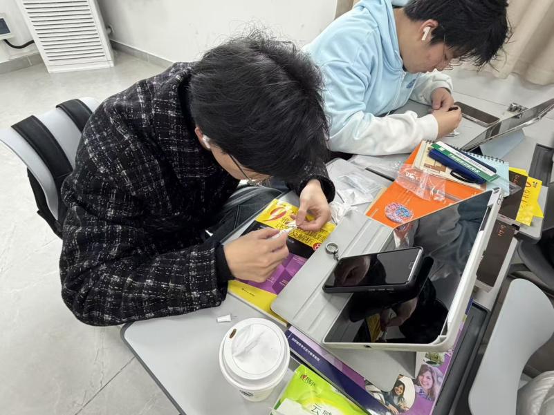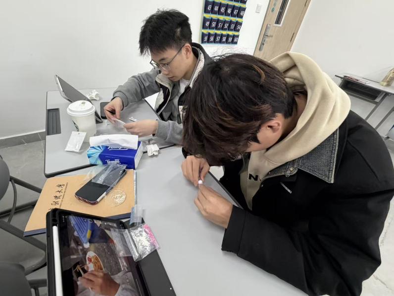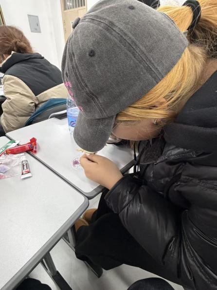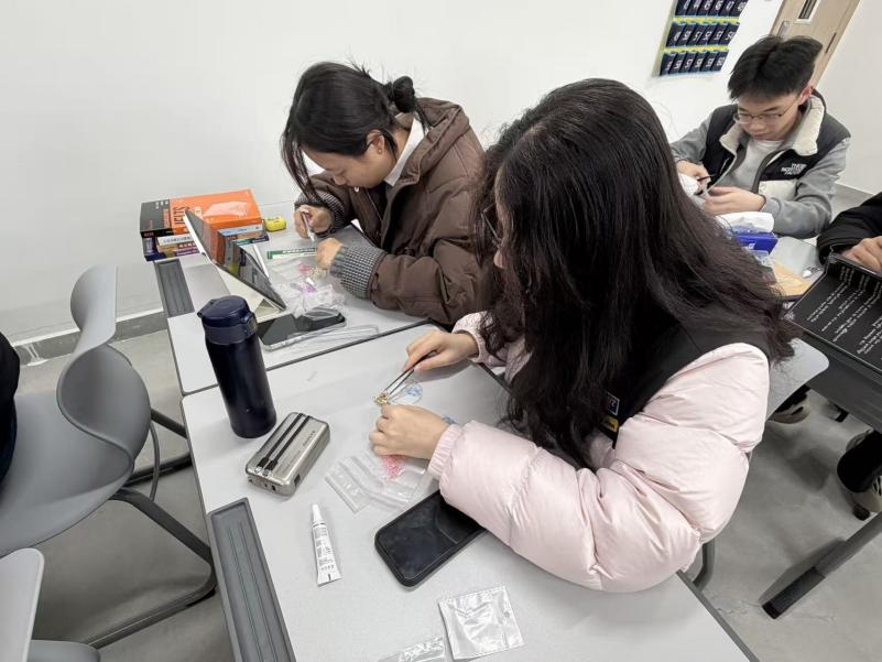 在随后的120分钟匠心手作环节中,现场气氛热烈而专注。会计2561班的同学们自由结组,互相协作。大家手持镊子与剪刀,小心翼翼地挑选、裁剪贝壳片,并将其粘贴在胸针的底托上。