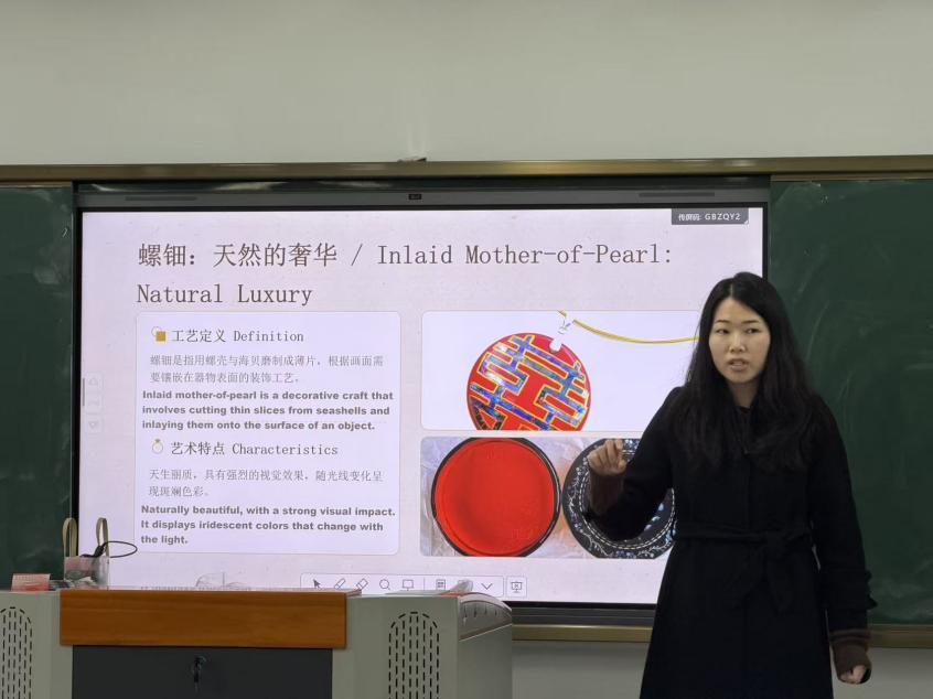 活动伊始,非遗指导老师通过生动的讲解,带领大家走进了螺钿工艺的千年历史长河。从唐代的漆器珍品到现代的创新设计,老师深入浅出地介绍了螺钿的工艺特点与文化寓意。在"破冰"环节,同学们近距离观察了精美的螺钿成品,细腻的光泽与独特的质感让大家惊叹不已,瞬间点燃了大家动手创作的热情。
