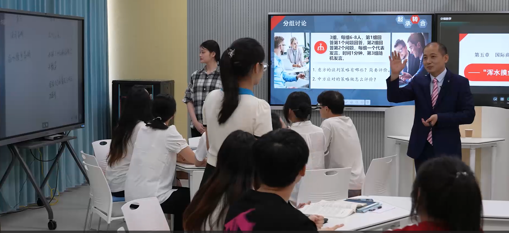 席庆高副教授选取其主讲课程国际商务谈判中的商务谈判案例分析与演练参加比赛。他的课程教学采用起承转合的教学模式,此教学模式是在起环节导入课程重点概念,突出知识点;在承环节围绕技能目标,通过提问和课堂做题让学生掌握知识运用;在转环节通过分析案例,培养学生分析问题、解决问题能力;在合环节对课程进行小结和融入思政元素,强调正确的谈判价值观和弘扬社会主义核心价值观。整个课程教学围绕知识、技能、素质三个教学目标,充分利用智慧教学工具,通过案例讨论、智慧抢答、弹幕点评、自由发言等教学方法,坚持以学生为中心贯穿教学全过程,以此激发学生学习兴趣和提升学生课堂参与度。