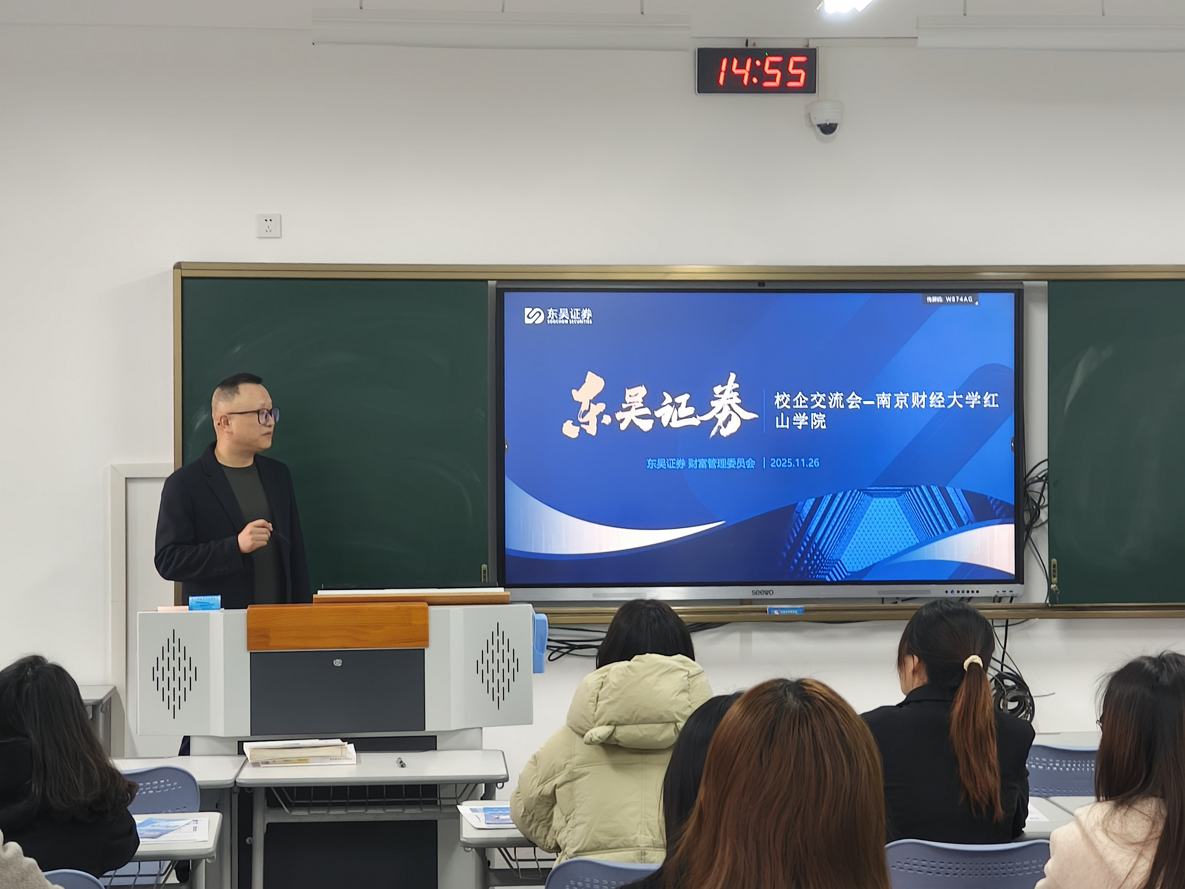 东吴证券作为国内综合类上市券商,拥有30家分公司、133家营业部。此次结合业务发展需求招募分支机构管培生,岗位辐射北京、上海、苏州、南京等多个城市,为毕业生提供多元化职业选择。面试会前一周,我院便联合东吴证券开展线上简历投递,面试当天应聘者齐聚智圆B区215教室,总经理楚殿斌详解行业发展前景、岗位任职要求及薪酬福利体系,并针对应届生关心的职业晋升路径进行互动答疑。