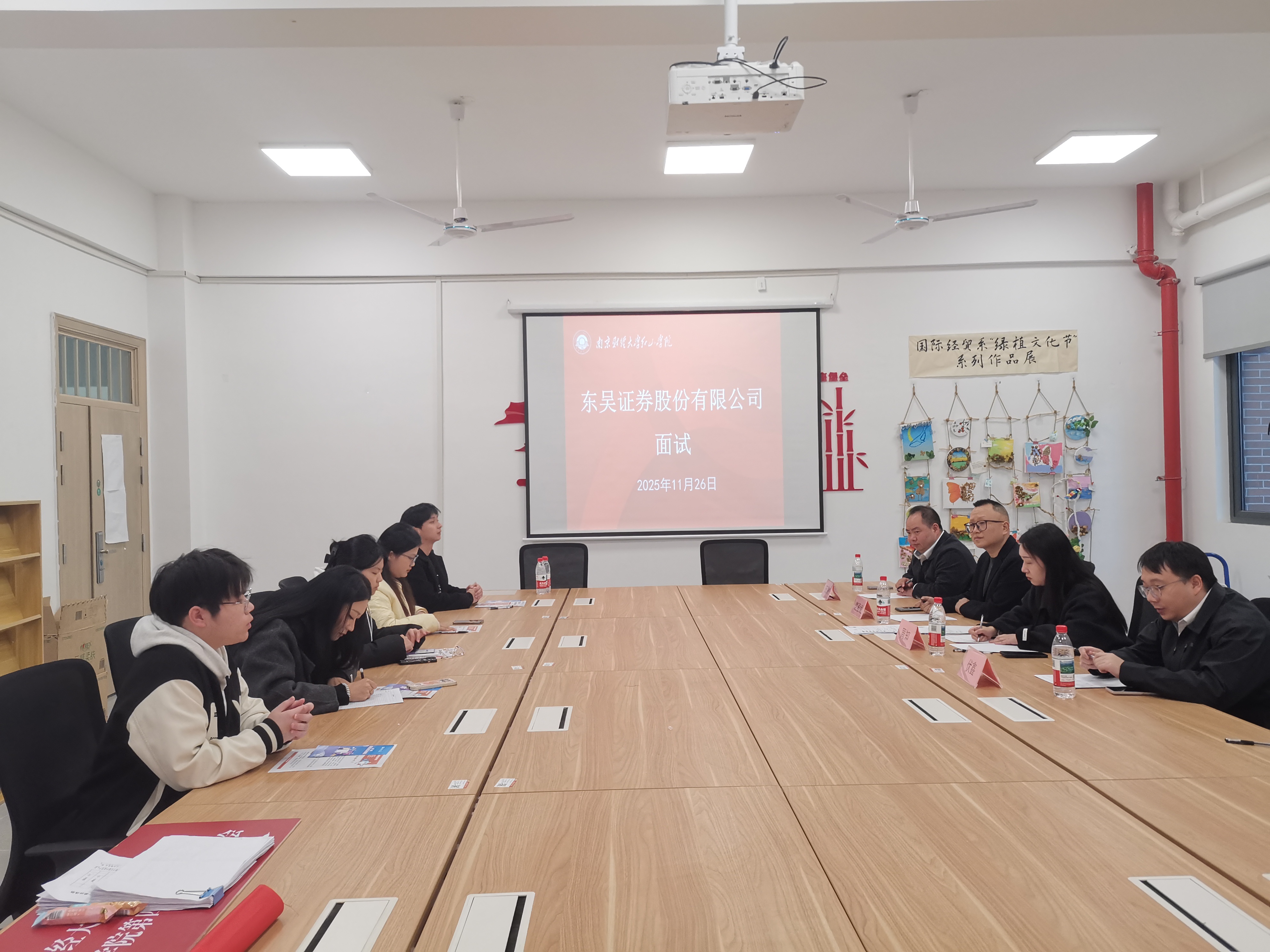 为精准对接企业用人需求,助力2026届毕业生实现高质量就业,11月26日下午,我院联合东吴证券股份有限公司举办专场招聘。东吴证券股份有限公司秀财事业部总经理助理、南京分公司副总经理楚殿斌,南京分公司人事经理周知,南京分公司南京国睿大厦证券营业部副总经理王鹏、团队负责人伏鑫受邀在智圆楼开展管培生现场选拔活动。院党总支书记、院长刘志国,党总支副书记陈玉龙到场指导,活动由团总支书记兼学工秘书宋婧牵头组织。本次面试吸引贸易经济、财务管理、金融税收等专业40余名应届毕业生到场参与,现场求职氛围热烈。