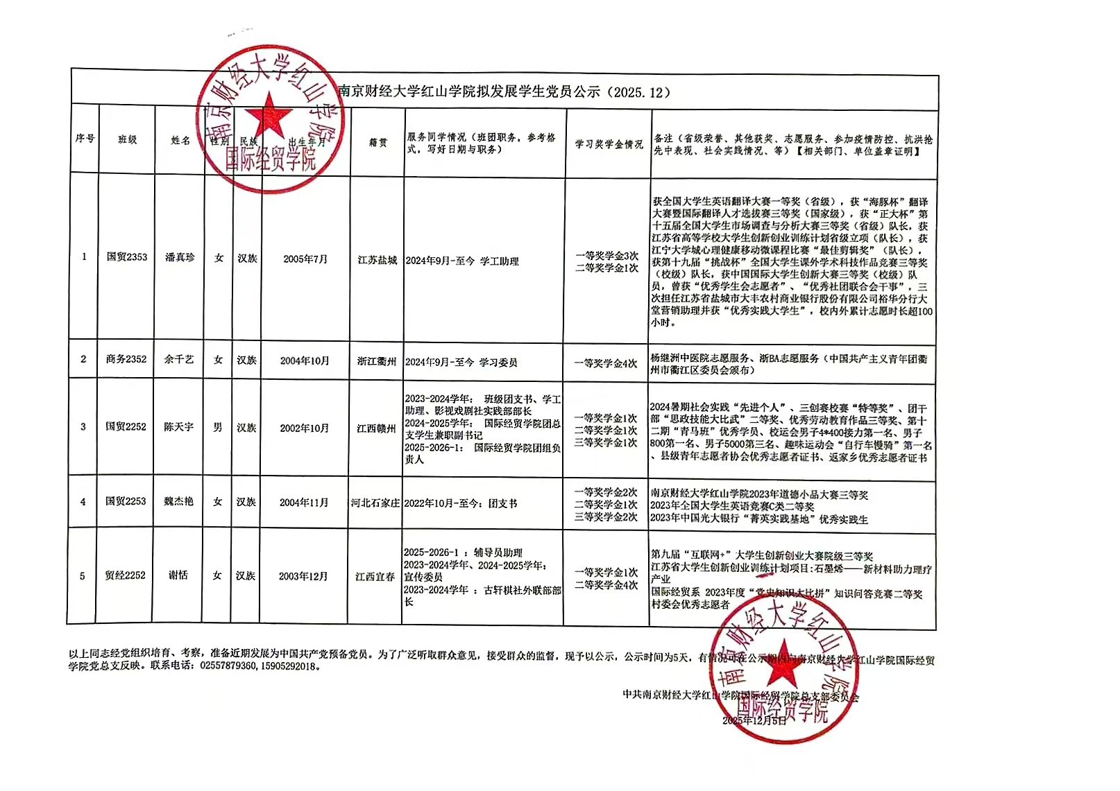 以上同志经党组织培育、考察,准备近期发展为中国共产党预备党员。为了广泛听取群众意见,接受群众的监督,现予以公示,公示时间为5天,有情况可在公示期内向南京财经大学红山学院国际经贸学院党总支反映。联系电话:02557879360,15905292018。