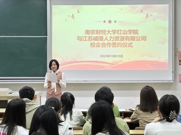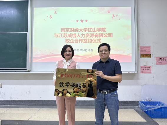 王晓庆副院长与王霞总经理签约结束以后,双方进行校企合作授牌仪式。江苏威缇人力资源有限公司授予我院“南京财经大学红山学院教学实践基地”牌匾,预示着双方结合学科特色和企业优势,深化校企合作,进一步促进产教融合,在企业家进课堂、教育教学改革、一流本科专业和课程思政示范专业建设、学生高质量就业等方面进行全方位合作。