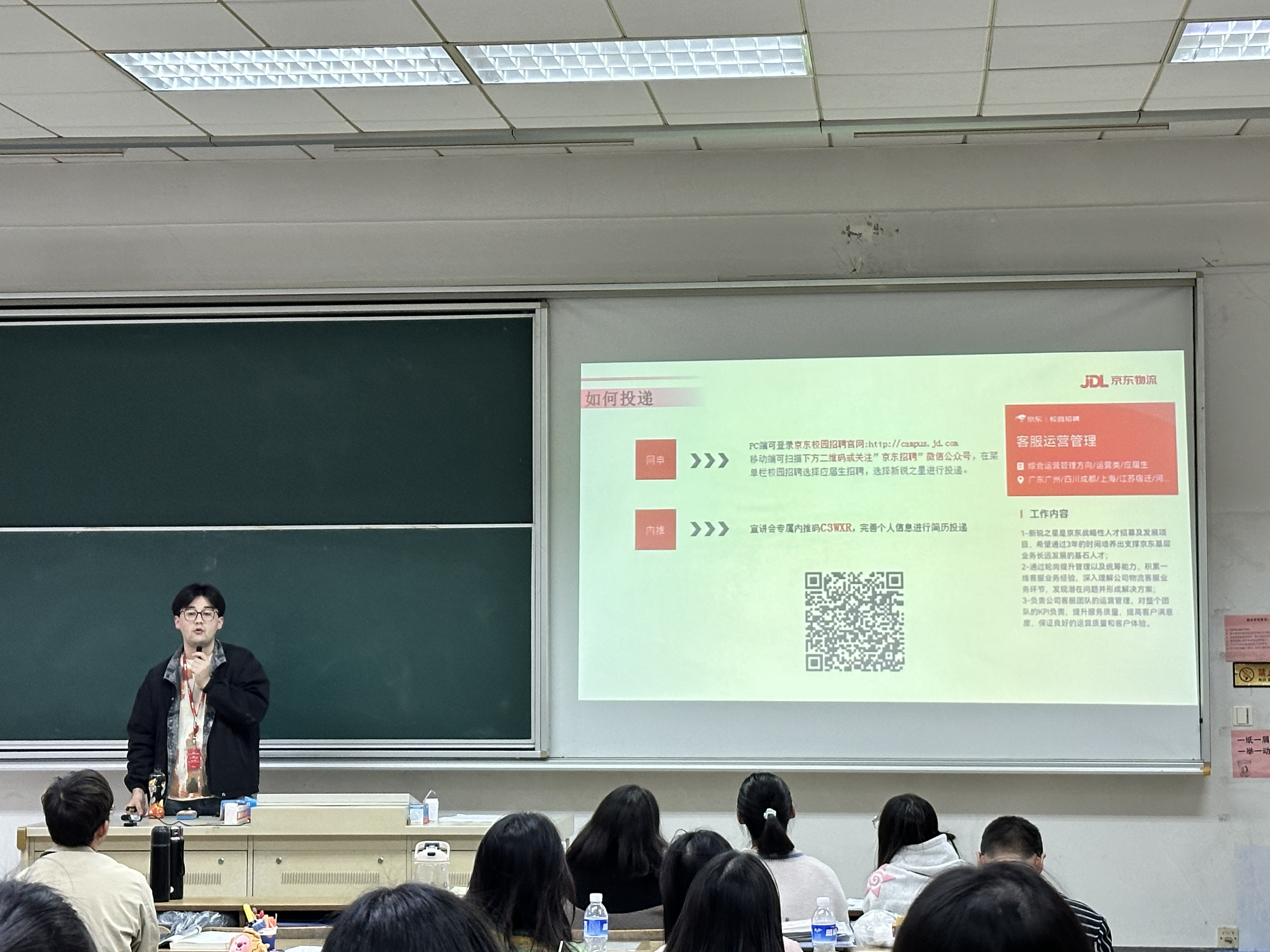为进一步做好2024届毕业生就业工作,拓展毕业生就业渠道,加强校企深度合作,11月21日下午,京东物流2024届“新锐之星”校园招聘宣讲会在福建路校区J1-102顺利举行。京东物流人力资源部东区校招组负责人艾力及京东物流人力资源江苏HR组何世杰做宣讲,市场营销和物流管理专业毕业生参加,大四辅导员现场维持秩序。