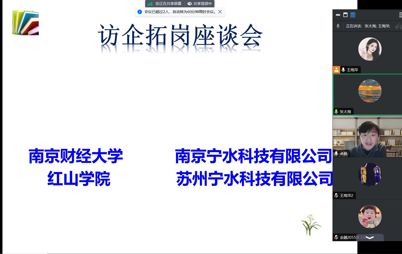 为贯彻落实教育部关于“访企拓岗”促就业专项行动,提高人才培养质量,实现毕业生高质量就业,1月17日下午,工商管理系党总支书记、系主任张太海以及系党总支副书记王海萍和毕业班辅导员一行与南京宁水科技有限公司和苏州宁水科技有限公司开展“访企拓岗”座谈交流会,以便开拓更多就业岗位和机会,全力促进2024届毕业生高质量就业,我院多个专业部分2024届毕业生参加。