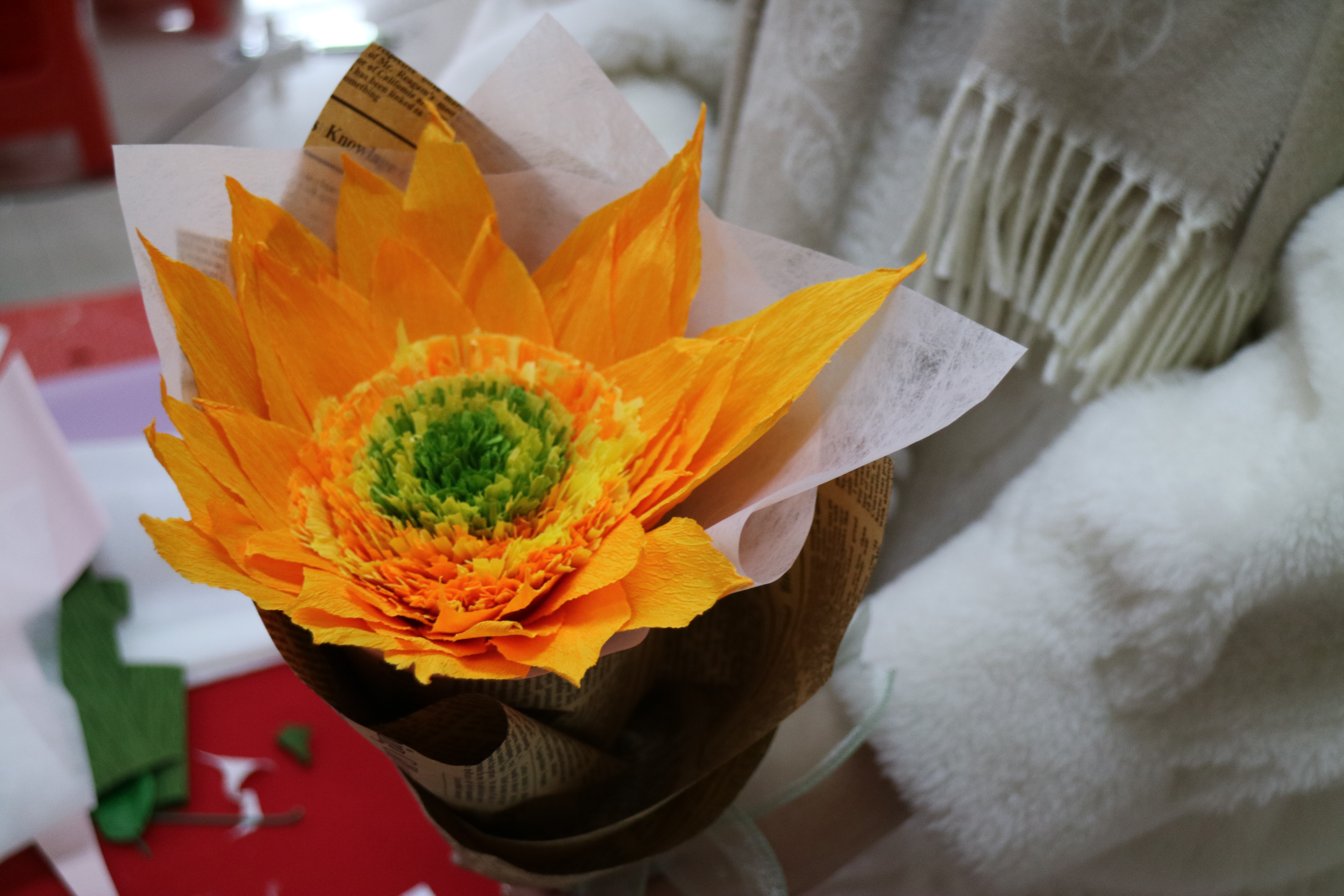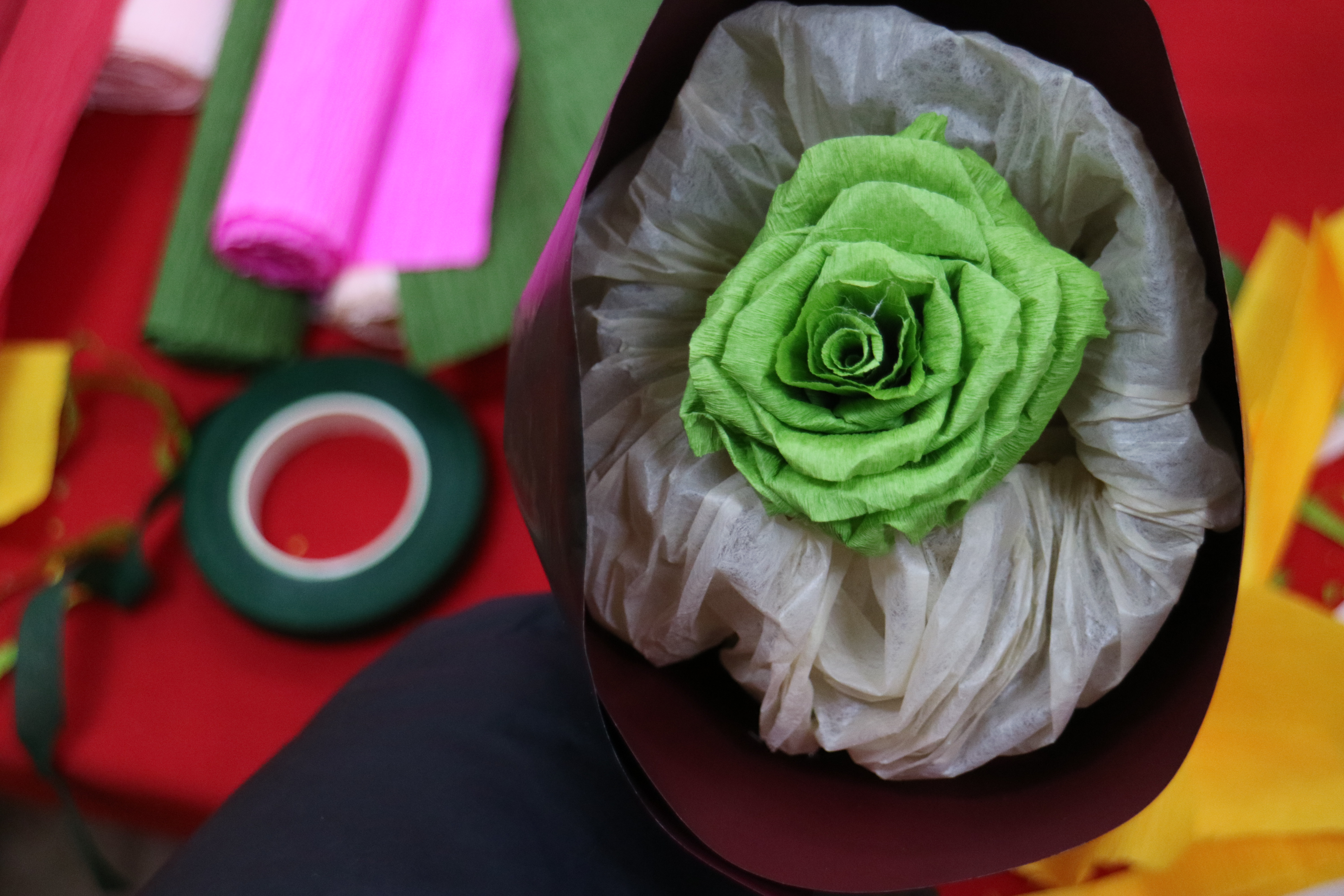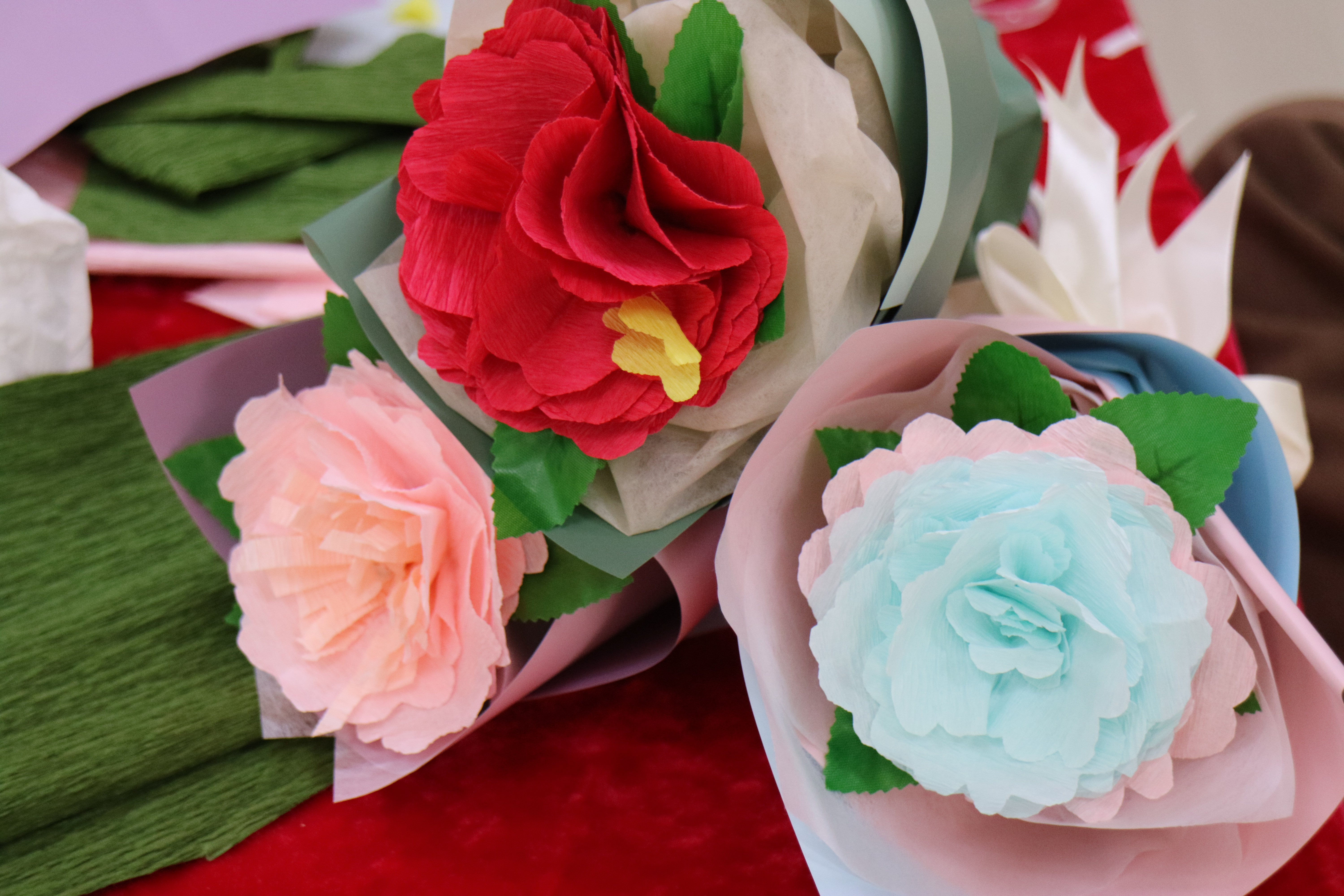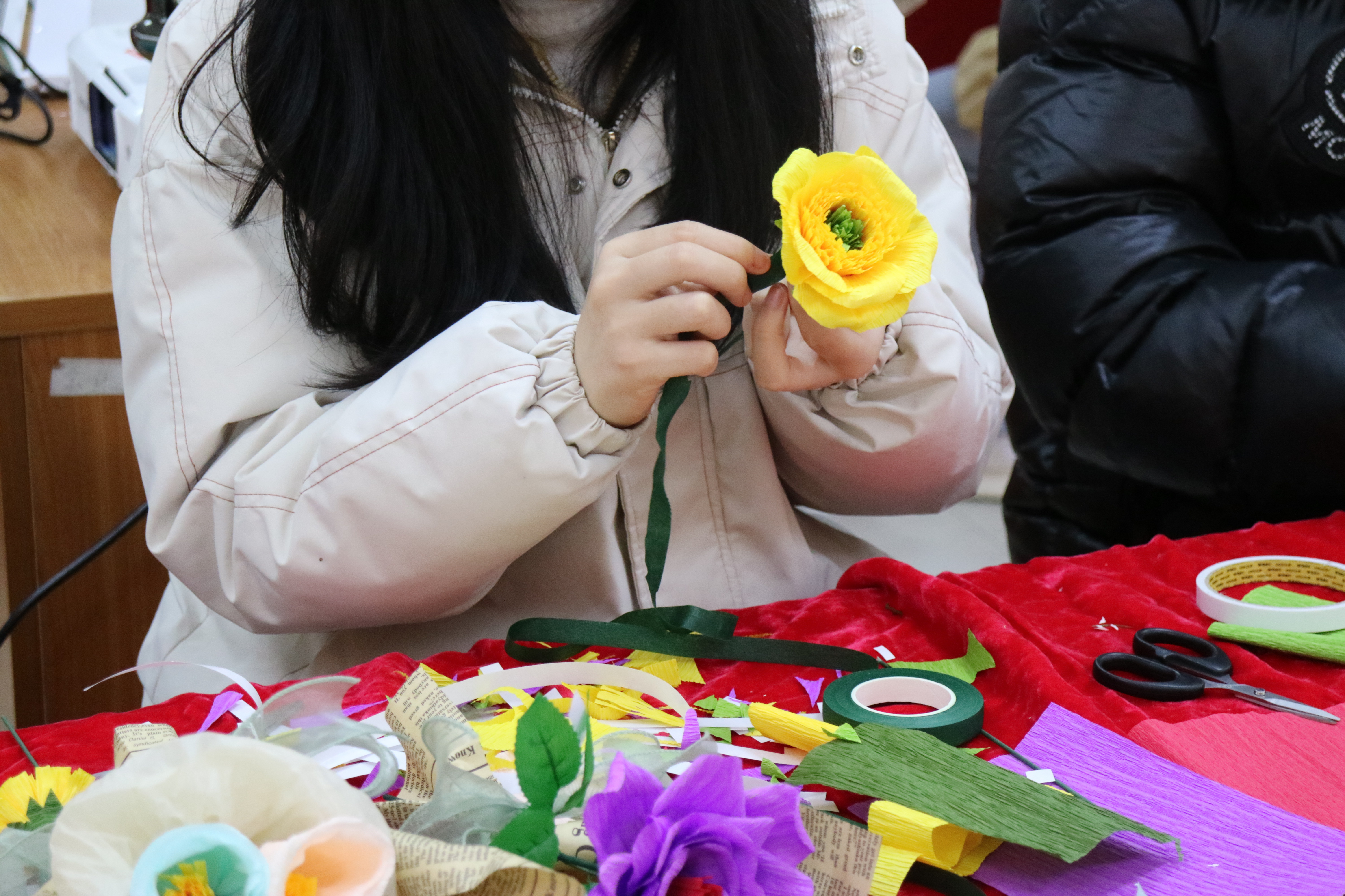 一张张被细腻折叠的皱褶纸、一段段被精心剪裁的彩带最终变成了品类多样的手工花