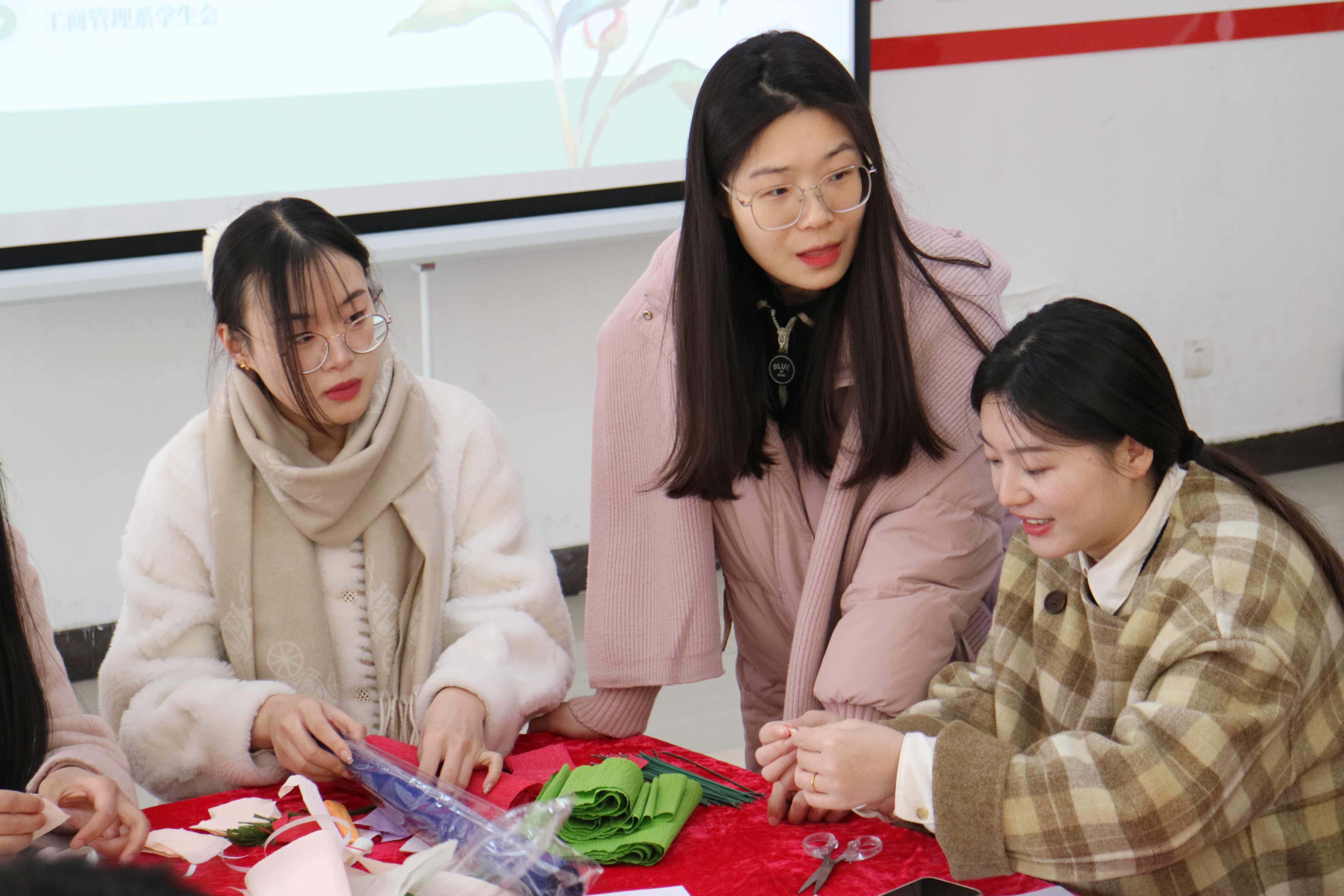 活动现场,工商管理系学生会提前准备好了丰富的手工花材料,包括皱褶纸、彩带、剪刀等,为参与者提供了广阔的创作空间。此外,工商管理系全体辅导员老师也亲临现场,为大家提供手工制作的指导与帮助,确保每位参与者都能制作出自己的满意作品。同时,活动现场还提供了精美的贺卡和花束包扎服务,鼓励同学们在特殊的日子里,主动向身边的女性亲友献出敬意与祝福,完成爱与善的接力。这不仅锻炼了同学们的动手能力,更让他们学会了用更加细腻的方式表达情感。