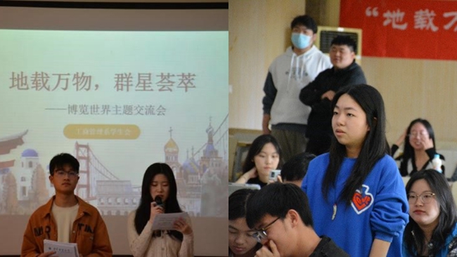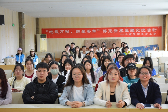 为深入学习贯彻党的二十大精神和习近平生态文明思想,增强学生保护地球的责任感,在第55个世界地球日到来之际,4月22日下午,工商管理系学生会于桥头校区大活报告厅举办了“地载万物,群星荟萃”博览世界交流活动。本次活动由人资2352班成宇欣和顾天昭两位同学主持,金融税收系学生会主席邵京蓝、国贸系学生会主席辜涵、会计系学生会主席孙一钧以及文法系学生会主席郭志伟受邀参加,共十支队伍参与交流学习。