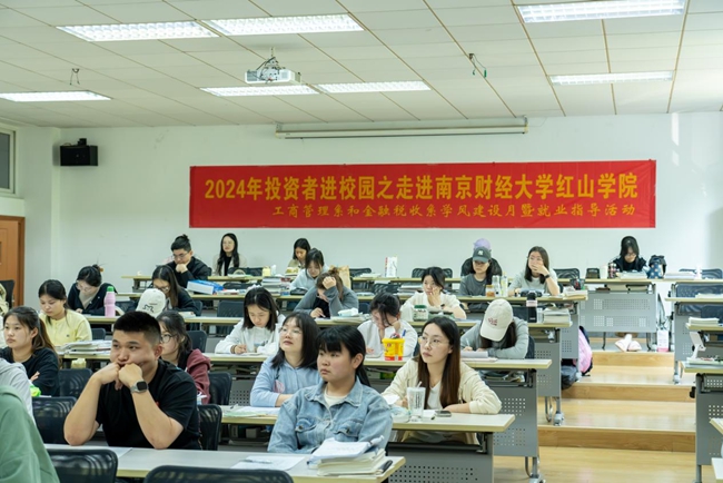 5月10日下午,工商管理系联合金融税收系于福建路校区J1-202成功举办“投资者进校园”职业生涯规划讲座和华龙证券招聘宣讲会。华龙证券股份有限公司江苏分公司财富业务总监董建国应邀主讲,金融税收系党总支副书记胡婉君、工商管理系党总支副书记王海萍及众多大三、大四学生参加此次活动。