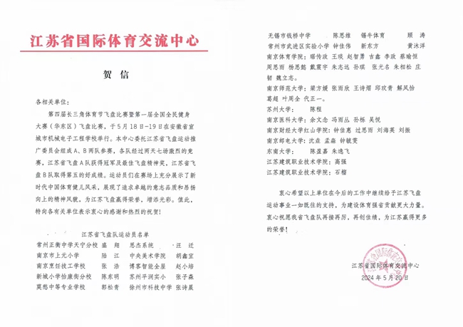 江苏省国际体育交流中心发来贺信,并向江苏省飞盘队运动员参与单位表示衷心感谢和热烈祝贺。