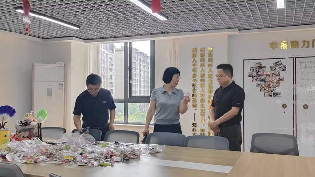 大丰社区党总支书记唐梅介绍残疾人之家手工作品