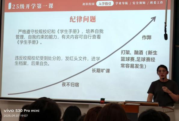班会上,辅导员老师们明确自身“学习引路人、生活贴心人、心理守护者”的角色定位,针对新生初入校园的迷茫与期待,她们围绕“身份转换”“主动成长”“寻求帮助”三大核心展开分享,句句贴近新生需求,干货满满;班主任老师则围绕“大学学业与能力提升”展开讨论,通过案例分析考研备考、实习准备、竞赛参与的时间节点与关键要点,解答了同学们关于职业发展的困惑。班会中师生互动热烈,学生分享计划、提问解惑,并表示此次班会让自己明确方向、感受到学院关怀。