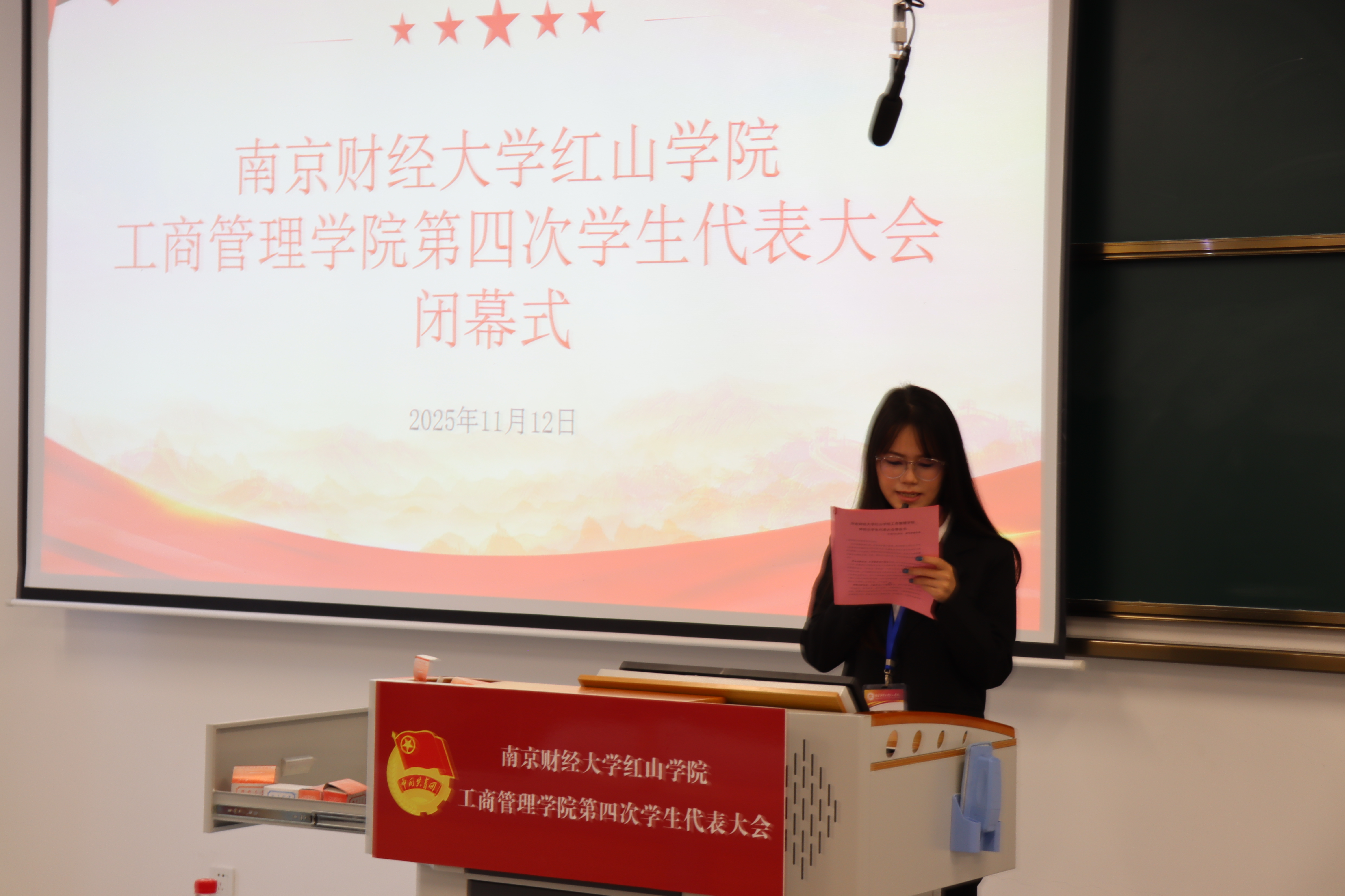 最后,工商管理学院团总支书记何玉凤致闭幕词。她代表工商管理学院学生会感谢大家为大会顺利举办提供的支持与辛勤付出。她对大会民主选举产生的新一届学生委员会及主席提出期望,希望同学们永葆“服务同学、助力成长”初心并送上对代表、新一届学生会及学院的祝福,宣布大会胜利闭幕。