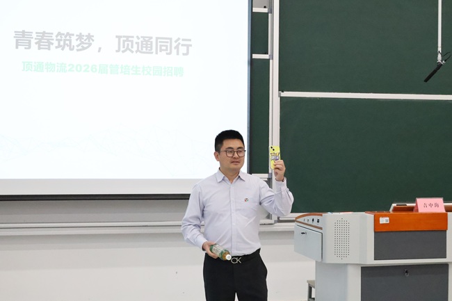 宣讲会上,顶通物流南京运营处DC主管宋金鹏首先围绕公司概况、管培生项目、薪酬福利与职业发展等核心内容展开了详细介绍,帮助在场学子全面了解企业的综合实力与人才需求。随后,顶通物流华东区人力资源部主管吉中海重点推介了本次招聘的管培生项目。该项目采用系统化通识培训、多岗位轮岗见习、一线顶岗历练的阶梯式培养模式,旨在助力应届毕业生快速成长为兼具专业素养与管理能力的储备人才。项目实行业务导师与发展导师双导师制,并为学子规划了营运督导、仓库主管等清晰多元的职业发展路径,为青年学子的快速成长成才保驾护航。