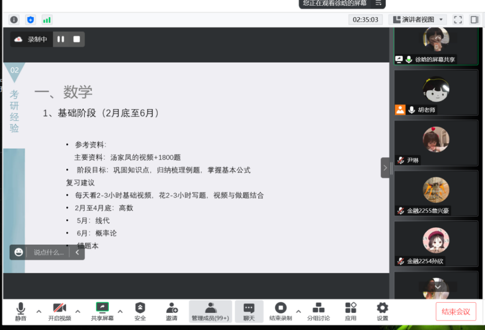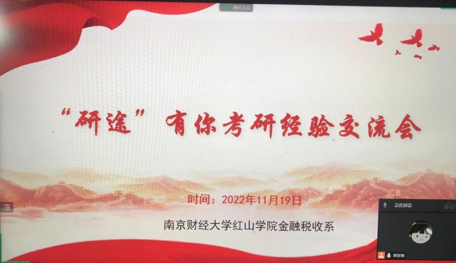 11月19日下午两点,金融税收系通过腾讯会议平台举办“研途”有你考研线上交流会,此次会议由金融税收系团总支书记兼学工秘书胡婉君主持并主讲,同时邀请了3名优秀往届生代表做经验分享。金融税收系学生在线上积极参与,交流会顺利举行,同学们表示受益匪浅。