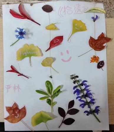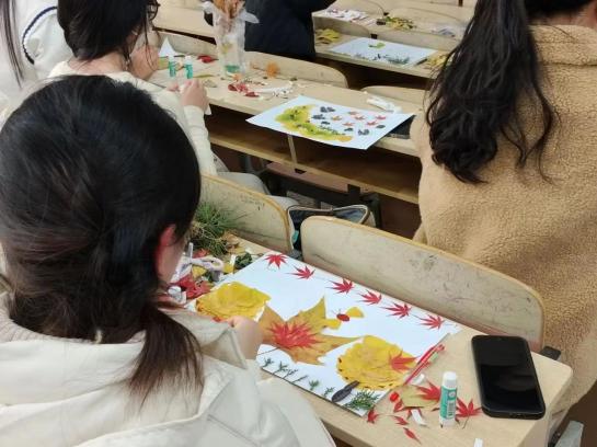 活动当天,大家齐聚4307教室,同学们带着收集的各种叶片,充分发挥自己的想象力,经过构图、修剪、上色、拼接、粘贴等步骤,绘制出精美并富有创意的手工制品,描绘出美丽的图案。同学们的创意作品主题鲜明,构思巧妙,制作精美,展现出大学生发现美创造美的能力和积极向上的阳光心态。