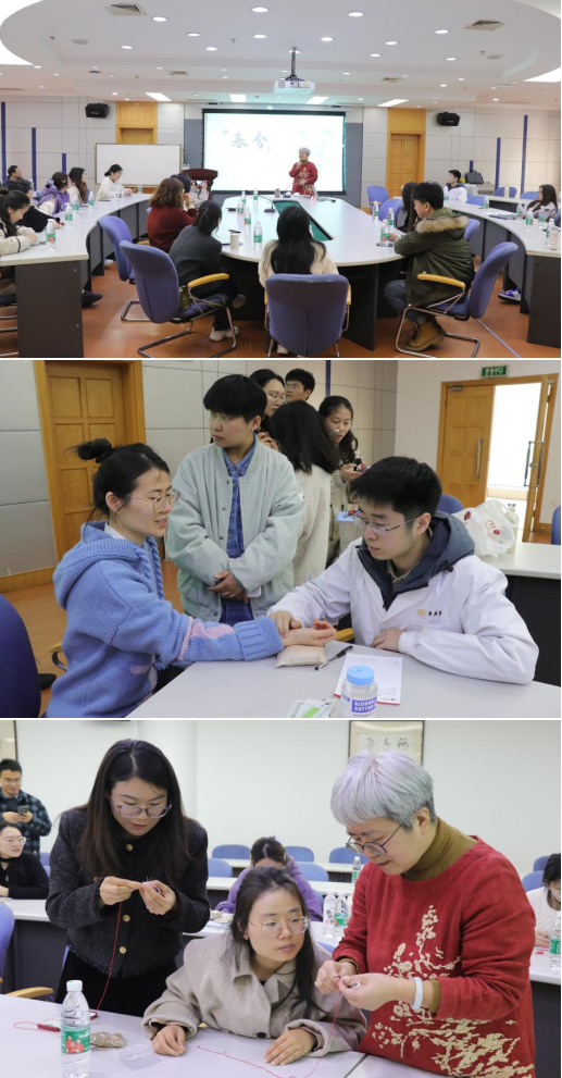 活动伊始,李瑶老师老师介绍了春分时节的特点与民俗活动,通过春分节气的中医养生讲解了“衣冠疗法”,并讲述了中草药香囊防蚊避讳、芳香辟浊的功效。张中元老师则讲授了中医正骨术,介绍了颈椎和肩颈的穴位按摩法,并为师生党员进行了诊脉和交流。