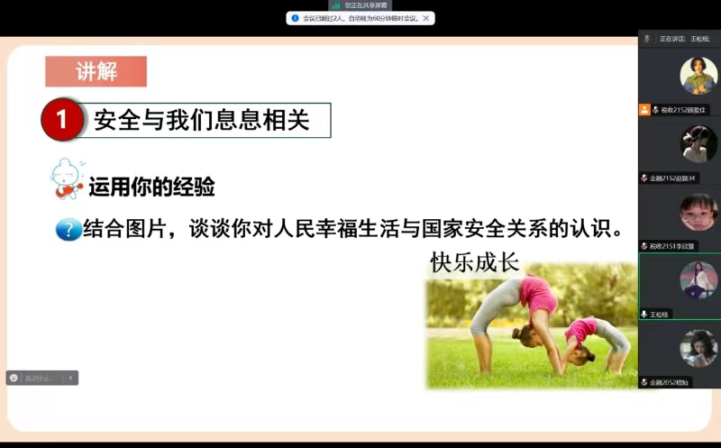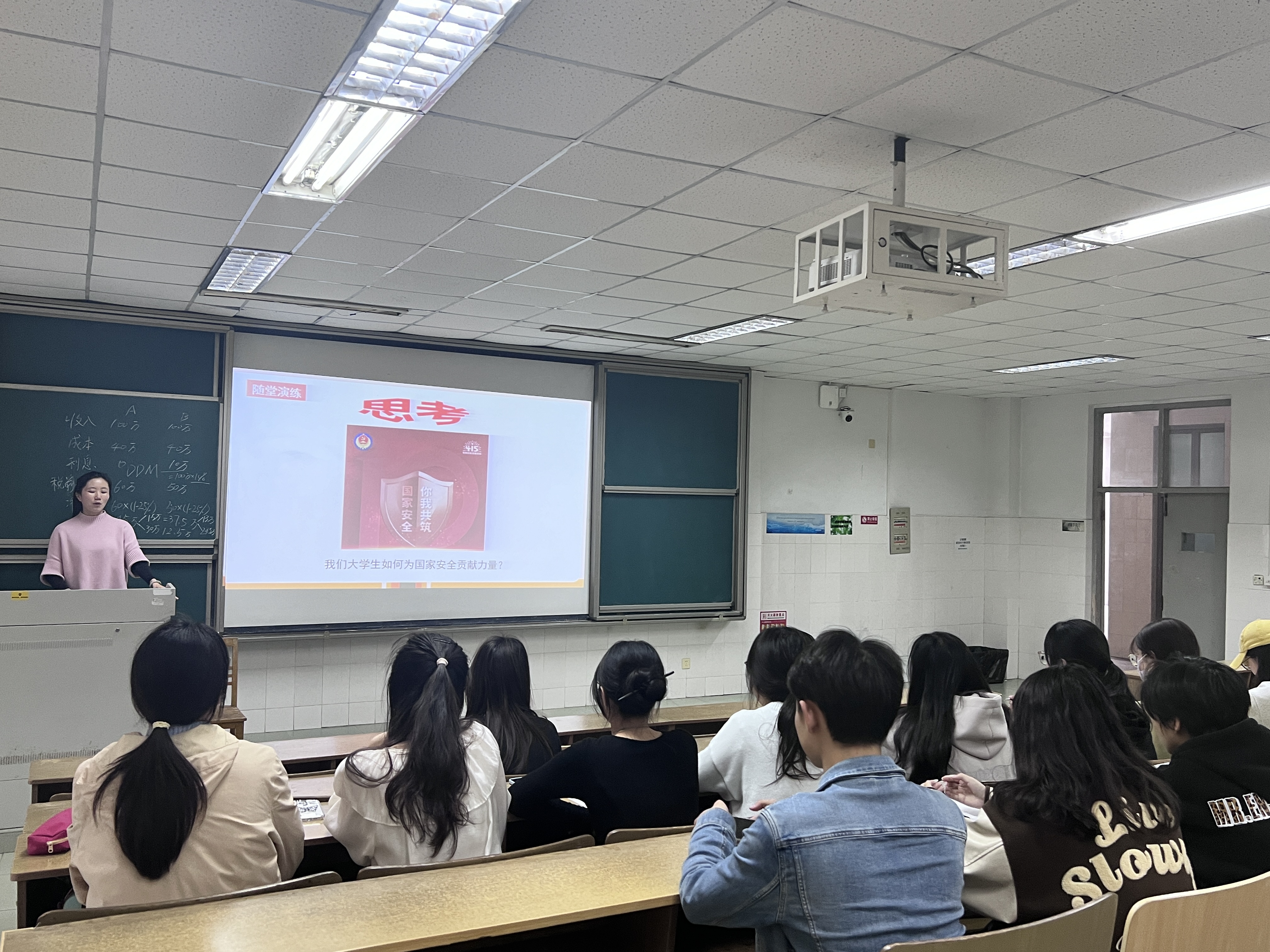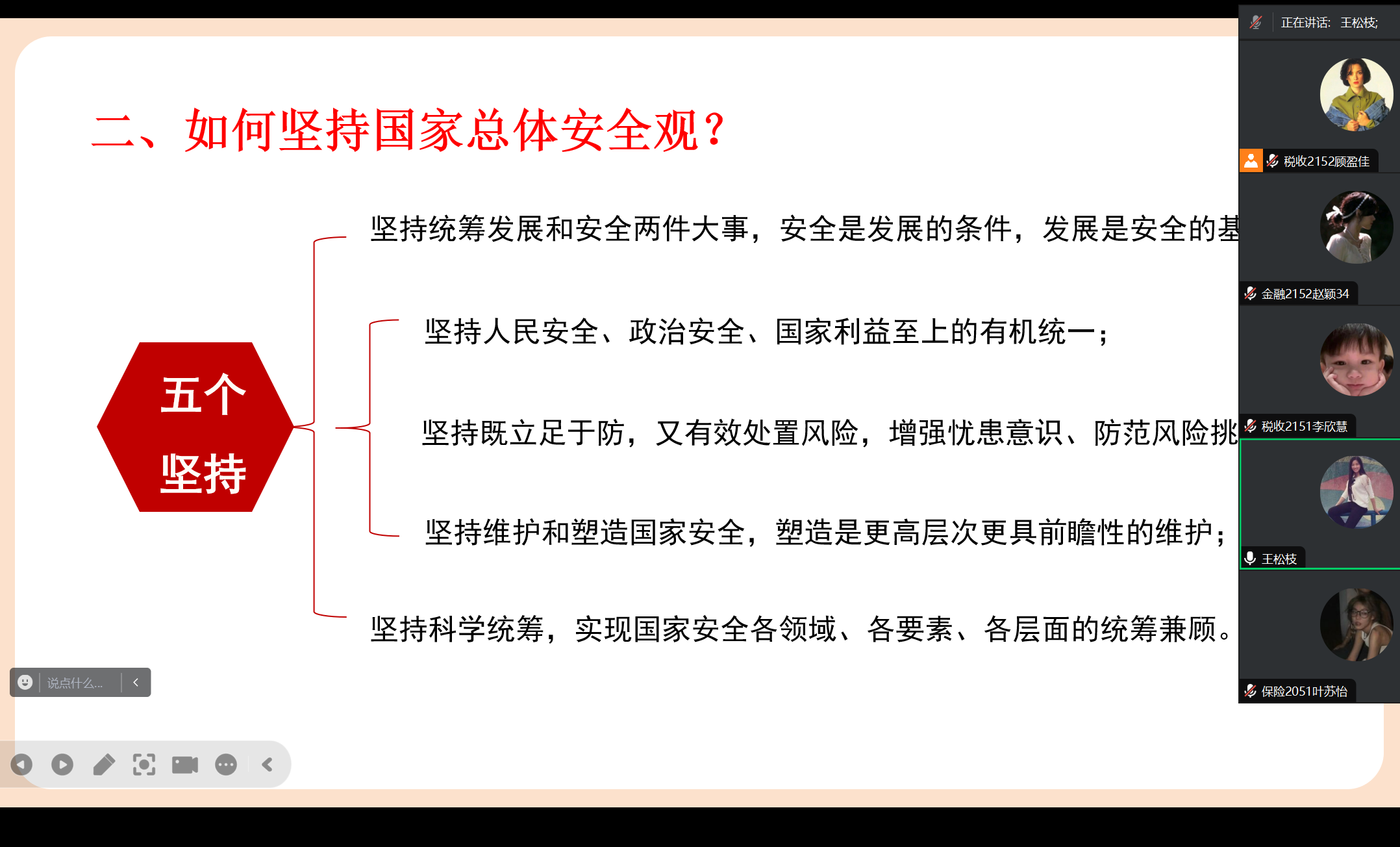 本次宣讲活动,王松枝老师首先通过通俗易懂的案例让学生明白国家安全与我们的生活息息相关,保证人民安居乐业,国家安全是头等大事;其次,王老师又向同学们说明了总体国家安全观提出的背景和国家安全教育日的由来;接下来又讲解了为什么坚持总体国家安全观及如何坚持;最后,王老师要求大家课下查阅相关资料,认真思考目前我国国家安全面临的挑战及作为一名大学生应该如何为国家安全贡献力量。