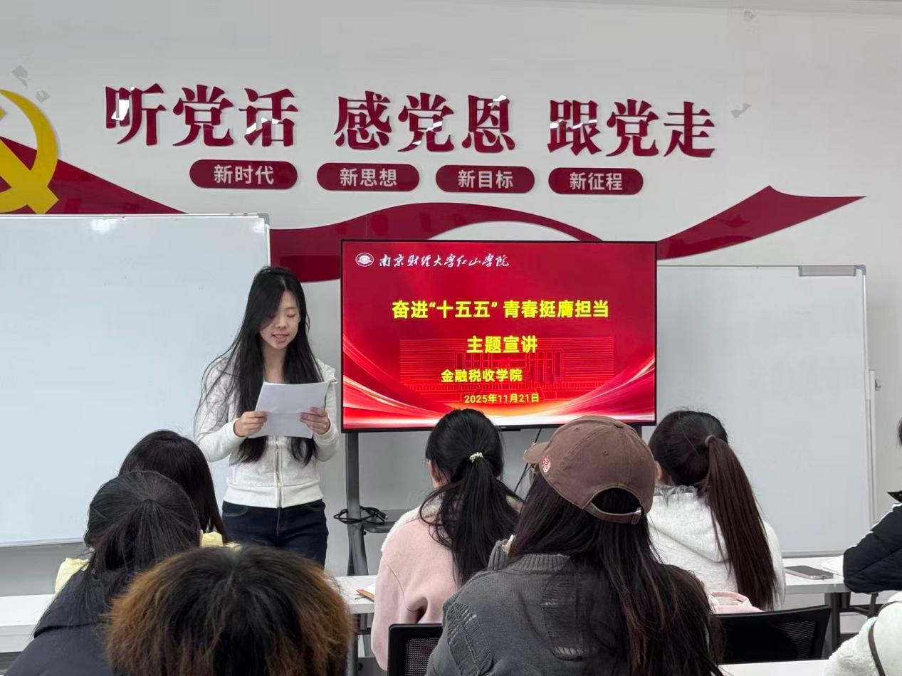 学院团总支部门负责人、2024级税收学专业李雨轩同学以“洞察‘十五五’新蓝图,谱写金融税收新篇章”为题作主题发言。她结合专业学习,从高质量发展、科技金融、绿色转型、共同富裕等维度,解读了“十五五”规划对金融与税收领域提出的新要求和带来的新机遇,鼓励同学们将个人成长融入国家发展大局。
