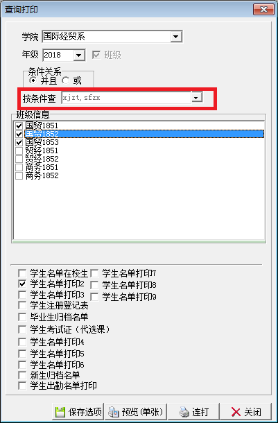 登录正方教务管理系统,选择学生管理 - 查询统计打印 - 学生名单打印,“按条件查”设置为“是否在籍”、“是否在校”、选择打印班级,勾选学生名单打印2,点击连打,即可。