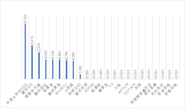 2.根据问卷调查学生对学习软件掌握不熟悉的占5% ,学生评价前三的软件是中国大学MOOC、腾讯QQ、超星学习通,分别占25.45%、15.47%、12.23%,结合学生、教师反馈的情况看,少部分教师、学生使用各种平台、工具结合运用还不够熟练;有的老师软件使用较多,造成课堂教学未能及时开课,教学、互动等过程不够流畅,教师、学生有点手忙脚乱少数老教师还需要与年轻教师、学生之间互帮互学,尽快掌握在线教学方法。