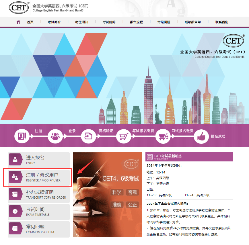 1.考生登录报名网站http://cet-bm.neea.edu.cn,点击“注册/修改用户”按钮。