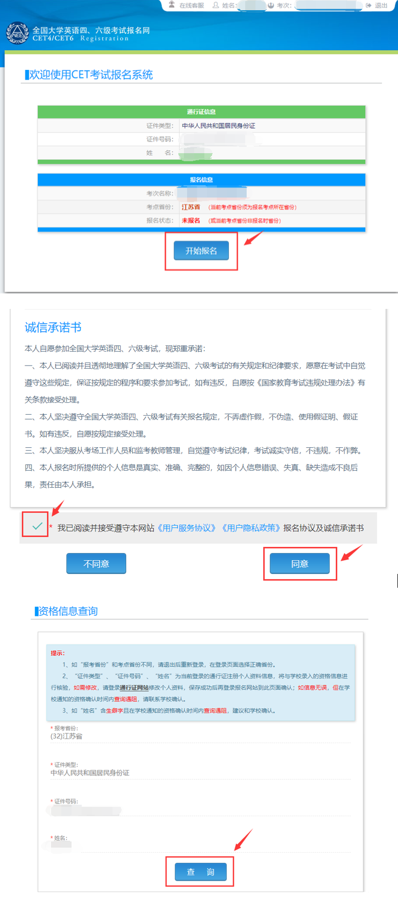 2.点击“开始报名”,同意报名协议及诚信承诺书后进入资格信息查询界面,输入本人身份证号码,点击“查询”。