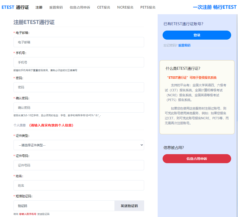 报名系统需要学生在ETEST上注册个人账号,并生成个人专属的ETEST通行证。分为以下两种情况: