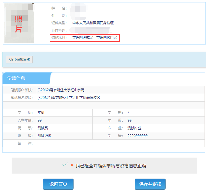 3.在“资格信息确认”界面仔细核对本人照片、姓名、证件号码、资格科目、笔试报名学校、笔试报名校区、年级、院系、专业、班级、学号等所有信息。