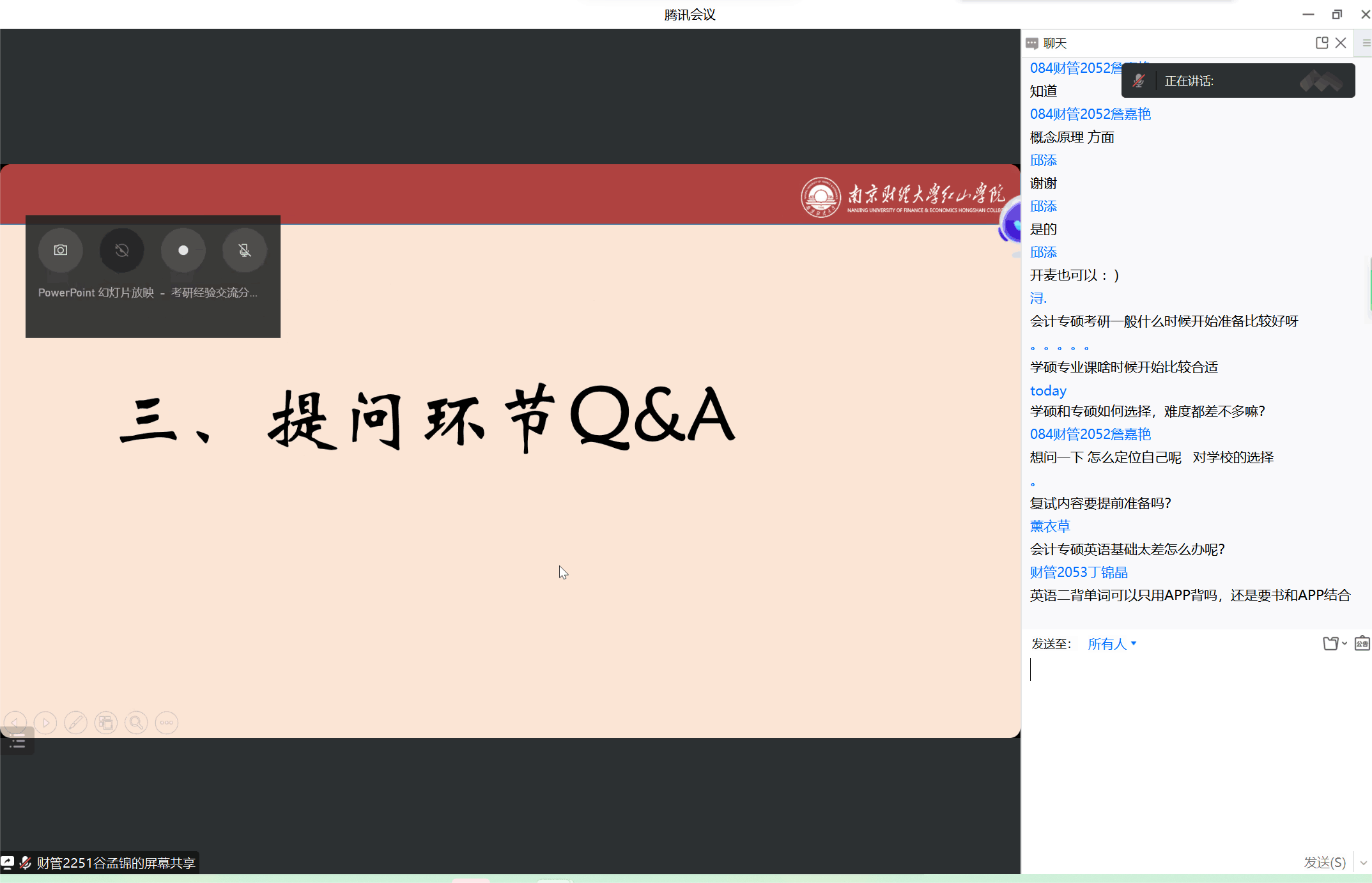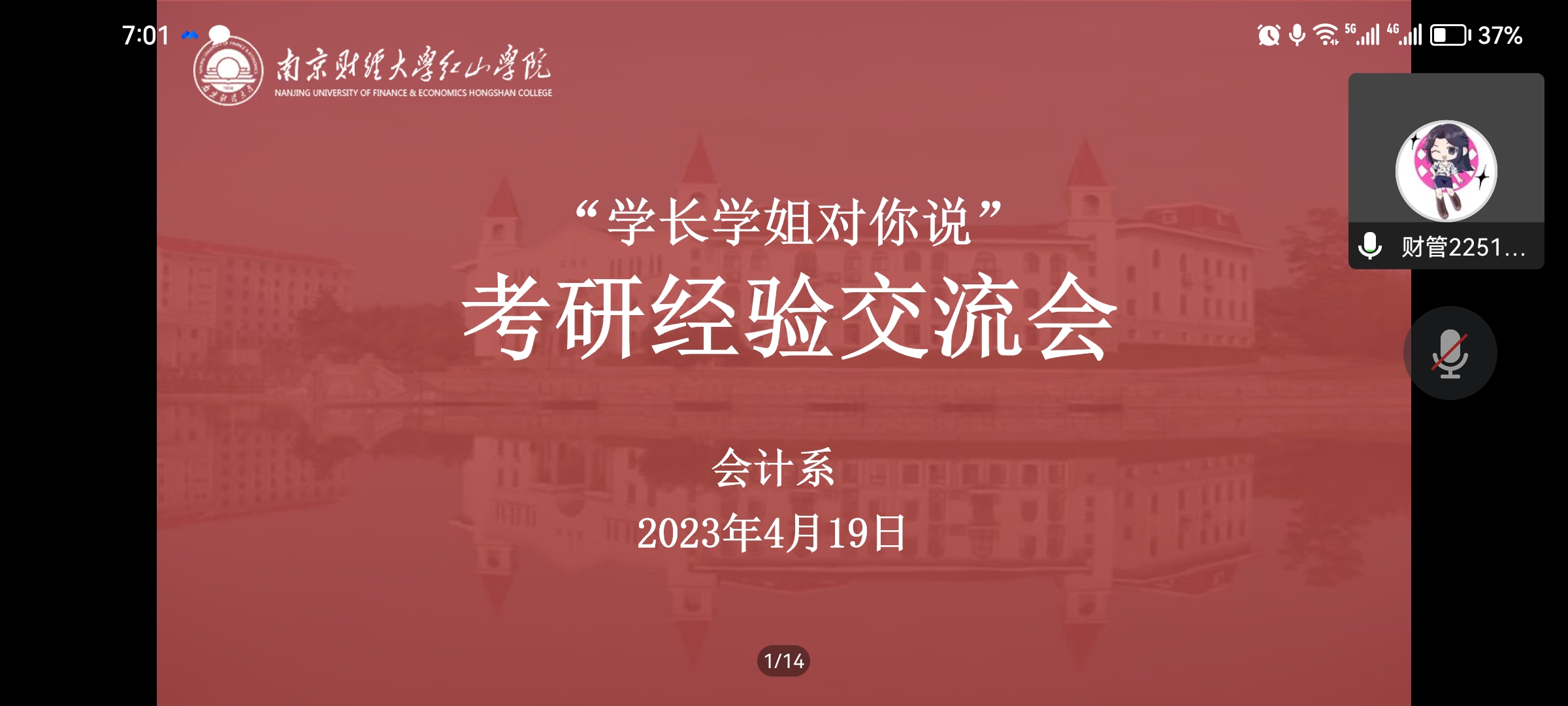 4月19日晚,应会计系邀请,2022届校友花艳、刘紫阳做客线上考研经验交流会。本次活动由系学工秘书王颖老师、班主任邱添老师组织,财管2251班团支书罗梦柔主持,会计系学生通过线上平台腾讯会议参会。