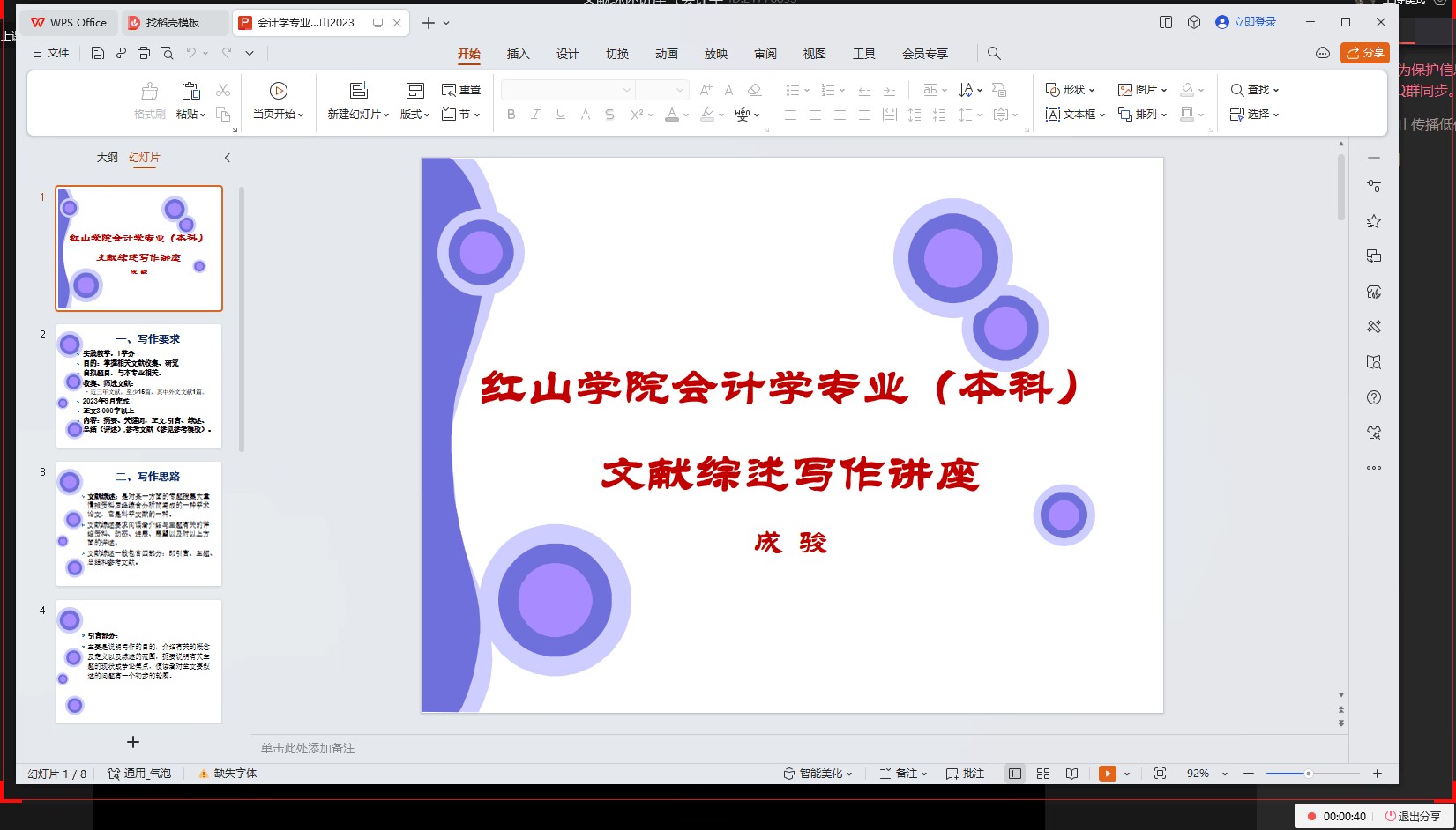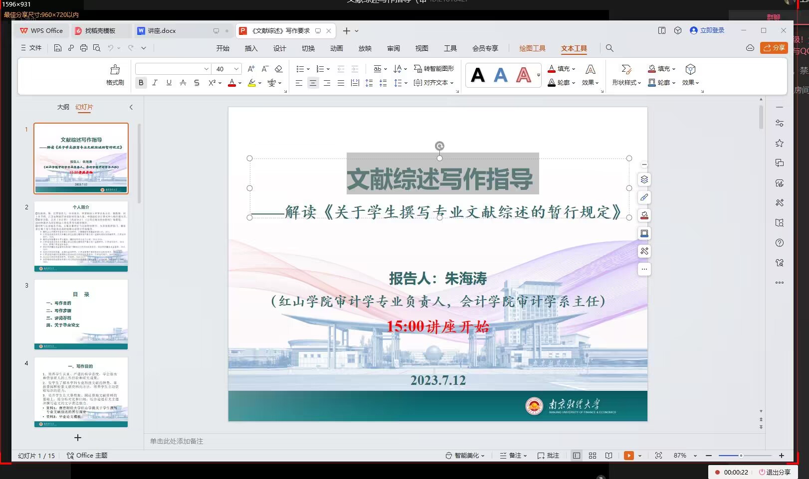 讲座主要围绕文献综述写作方法和技巧、论文写作思路和规范两大主题,从论文选题、文献搜索、摘要注意事项、论文框架及写作要求等方面,向同学们传授写作思路与技巧。同学们纷纷表示,对文献综述及论文的撰写有了更明晰的认知。