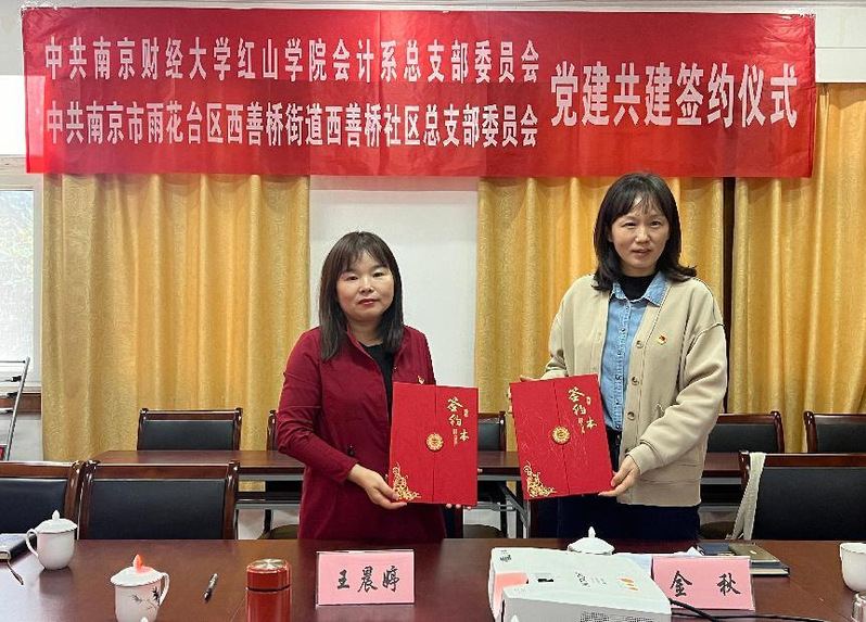 学院党委副书记、副院长、会计系党总支书记王晨婷和西善桥社区党总支副书记金秋分别代表校地双方签署了党建共建协议。
