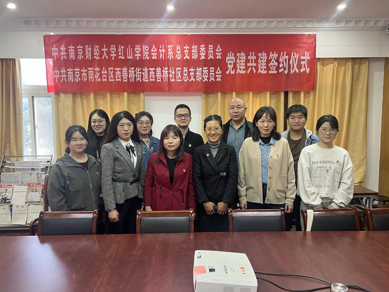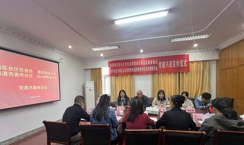 为进一步加强基层党组织建设,创新党建工作模式,促进资源共享与优势互补,深入推进校地协同发展,11月8日上午,会计系党总支与雨花台区西善桥街道西善桥社区党总支在福建路校区教A-220会议室开展党建共建座谈会暨签约仪式。西善桥街道党建办公室主任马传海,西善桥街道保管办社区建设科科长李丹,西善桥街道西善桥社区党总支副书记金秋,南京财经大学红山学院党委副书记、副院长、会计系党总支书记王晨婷,会计系主任孟翠湖,会计学专业党支部书记陈朋,审计学专业党支部书记吴昊冉,财务管理专业党支部宣传委员杨静参加仪式。签约仪式由会计系团总支书记李景程主持。