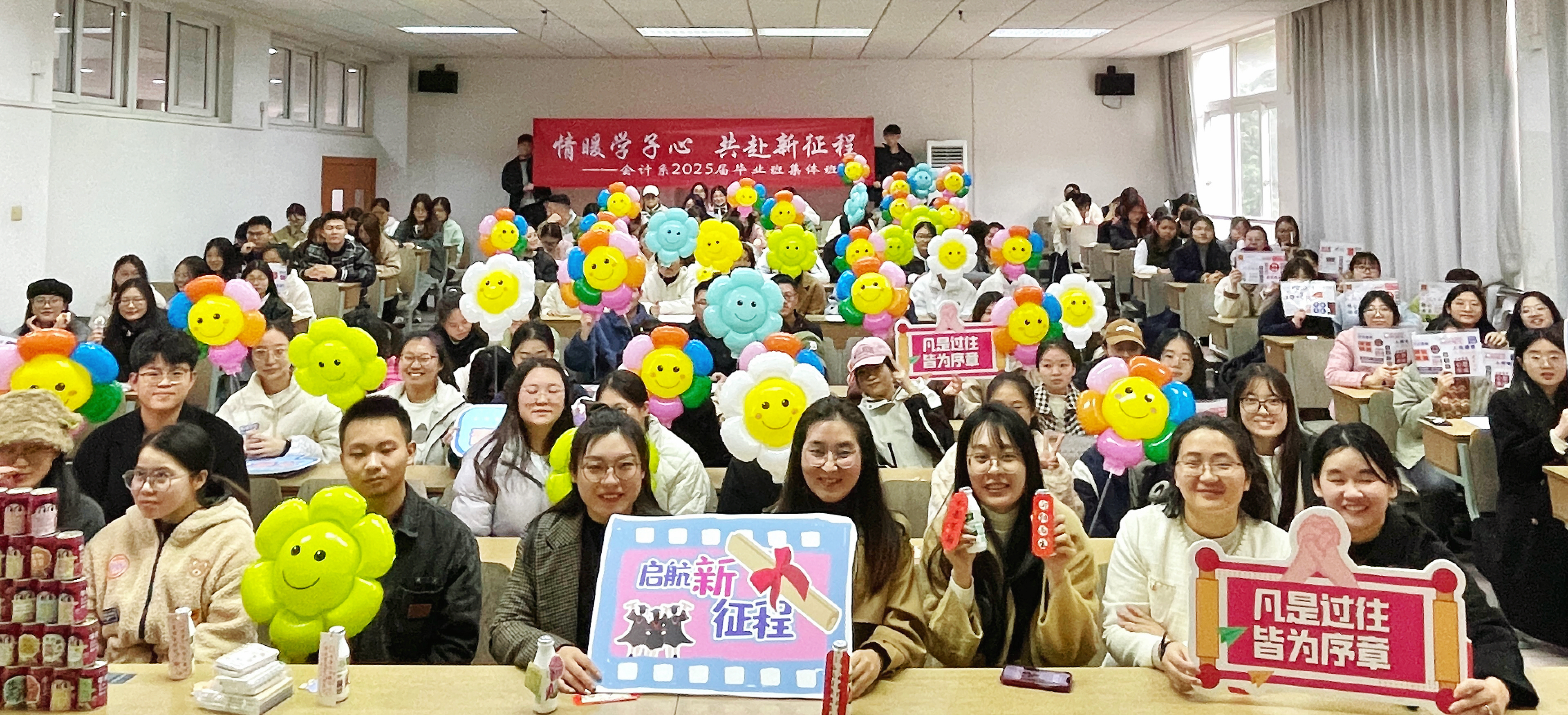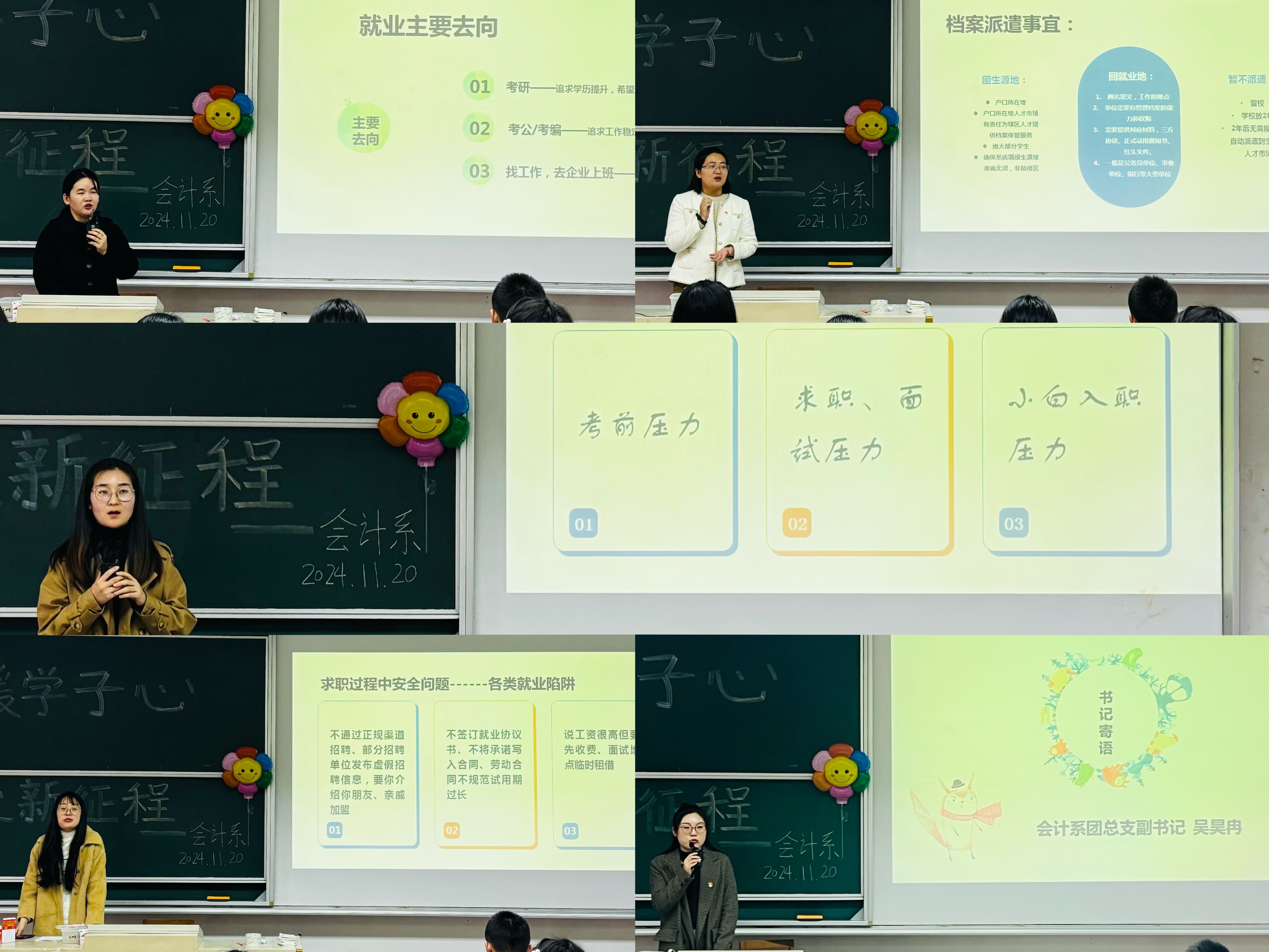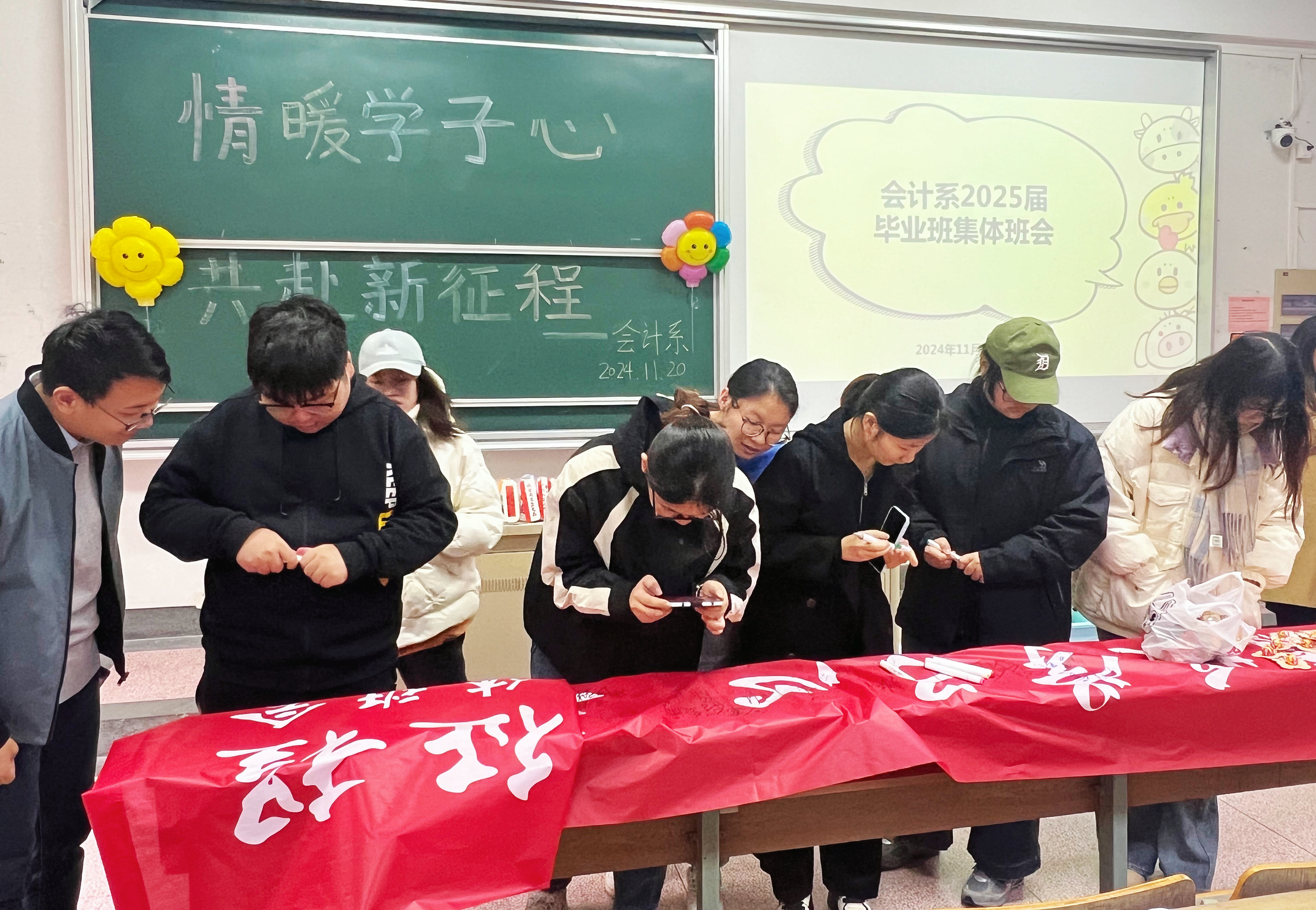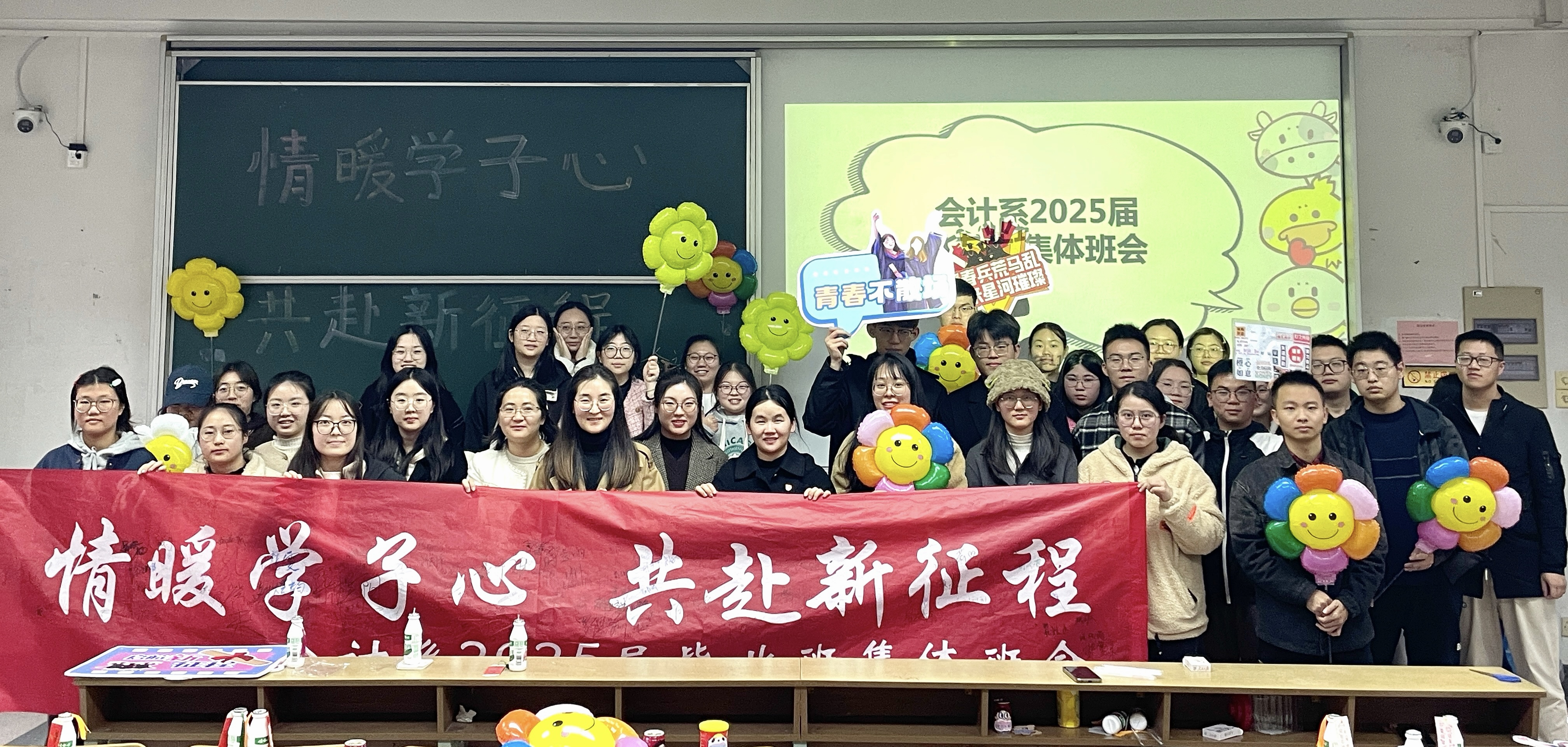 为扎实有序做好我系2025届毕业生实习离校教育,缓解现阶段毕业生就业与升学的焦虑情绪,聚力促进2025届毕业生高质量充分就业,于11月20日下午,我系在福建路校区J1-203举办了“情暖学子心,共赴新征程”2025届毕业班集体班会。本次集体班会由会计系辅导员陈朋主持,毕业班全体辅导员主讲,会计系团总支副书记吴昊冉参与,二百余名毕业生积极参加。