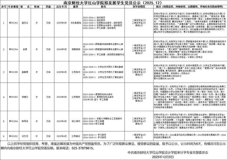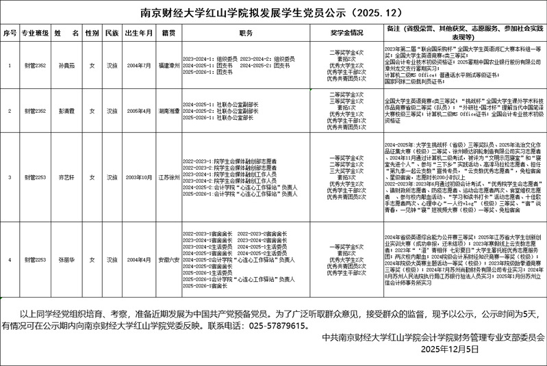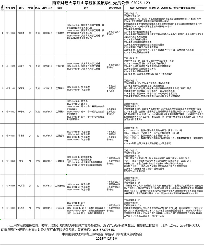南京财经大学红山学院拟发展学生党员公示(2025.12)