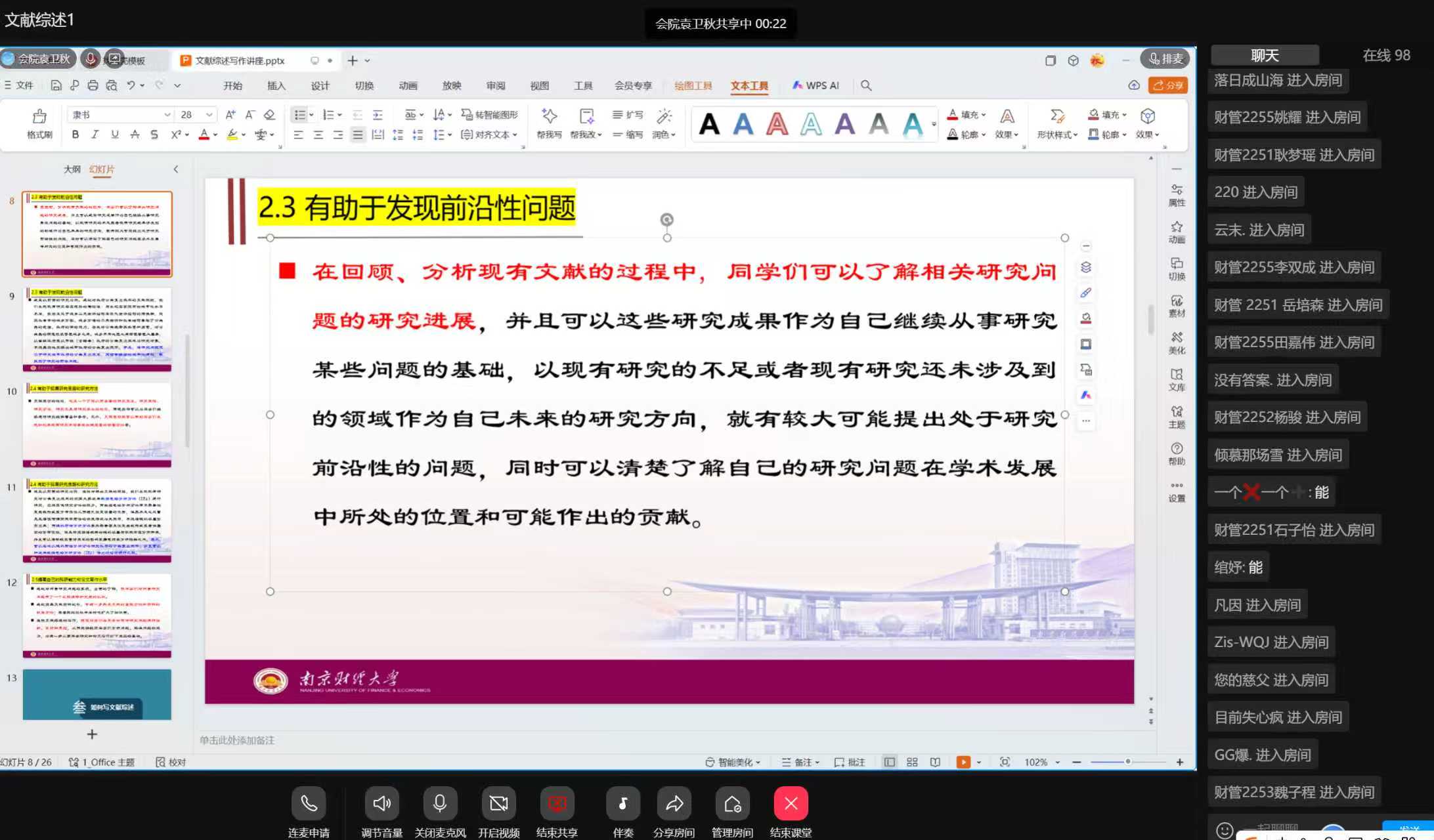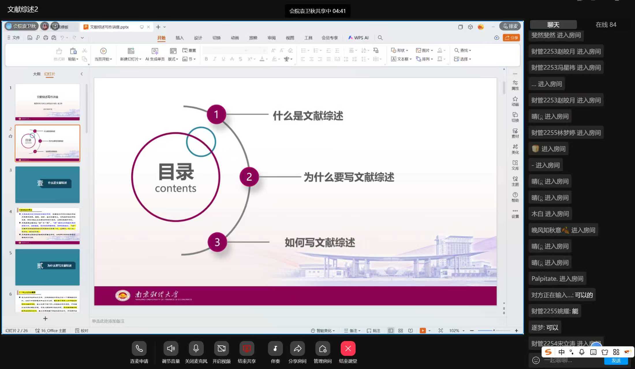 为扎实提升学生的学术素养与科研能力,规范学术写作流程,切实提高2022级本科生论文写作能力和水平,助力同学们顺利衔接毕业论文开题与撰写工作,2025年7月15日-7月20日,会计学院特邀财务管理专业负责人袁卫秋老师,审计学专业朱海涛老师,会计学专任教师万敏、姚梦琪四位老师联袂开展文献综述及论文写作指导专题讲座。讲座以线上腾讯会议、QQ群课堂等形式开展,我院2022级全体本科生参加。
