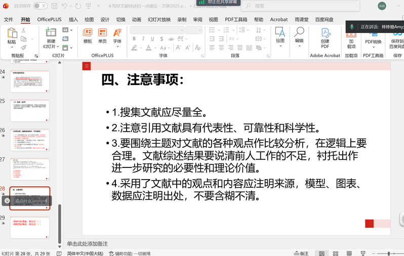 讲座主要围绕“文献综述写作方法和技巧”“论文写作思路和规范”两大主题展开。其中袁卫秋副教授重点解析了文献综述的前瞻性价值,通过回顾分析现有文献,同学们既能了解研究进展、锚定自身研究参照,也能挖掘未涉及领域或提炼前瞻性问题,同时明确自身研究的学术定位与贡献空间。随后,四位老师结合科研教学经验,从选题、文献检索、摘要撰写、框架搭建等关键维度拆解写作难点,还通过典型案例点拨常见误区,让抽象规范变得易懂实用。