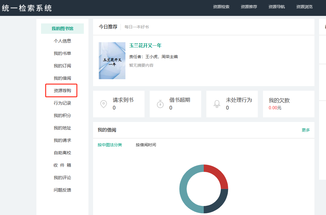2.登陆成功后点击右上角姓名进入我的图书馆页面,电子左侧菜单栏的资源荐购即可进入图书荐购板块。