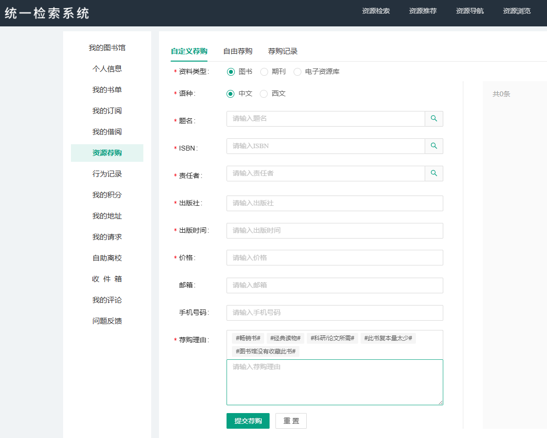 3.在资源荐购板块将标*栏目填写完成后点击提交荐购即完成图书荐购。