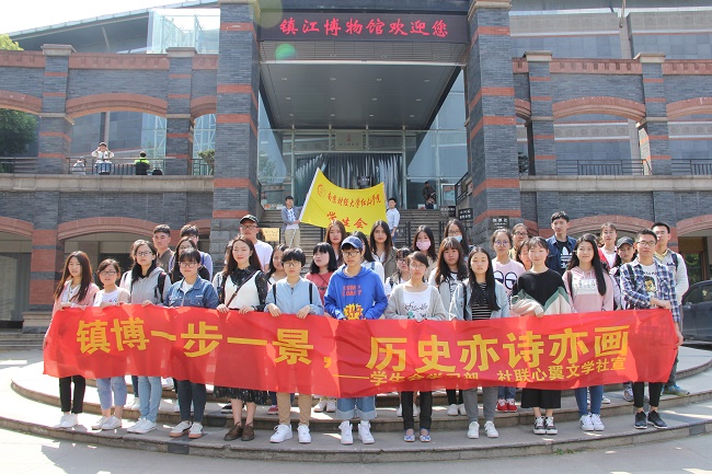 在镇江博物馆中,各组成员在负责人的带领下走进馆内,厚重的历史气息扑面而来。博物馆共分为五个陈列展厅,首先同学们进入的是青铜器展厅,江南吴国青铜器,具有浓厚的地域风格,它在形制、纹饰及合金成份、铸造工艺上很是独特,展厅陈列的宜侯夨簋、青铜伯簋、青铜凤纹尊等器具精美绝伦,深深吸引着同学们。