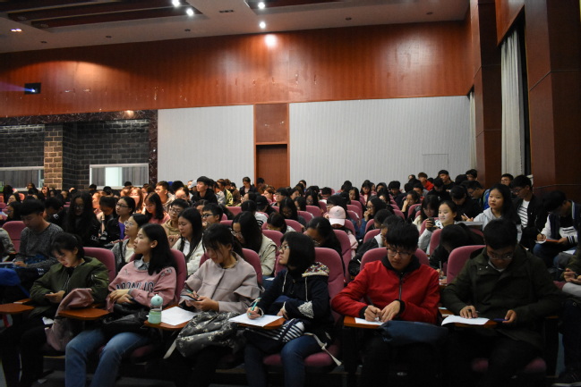 讲座初始,詹老师以风趣的言语,形象的比喻,切入了关于“大学生恋爱关系及关系处理”的话题,从而得出谈一场大学恋爱的重要性,全场气氛热烈,笑声不断,掌声雷动。