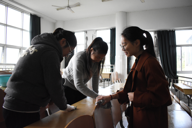 顶着冰冷的寒风,手持打扫工具,上午8时志愿者们于4103集合。在快速分配任务、工具,点名签到后,进入清扫活动中。或撕去桌上的占座纸条,或擦拭门窗讲台,志愿者们通过自己的行动维护着教室的整洁、展示着红山学子的风采。